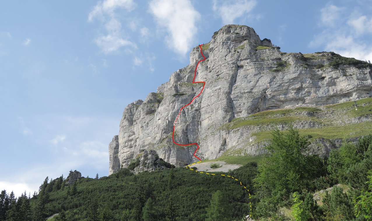 Die Tour wird unten von der Route Loserlolockvogel (7, 6+ obl.) gequert, siehe Topo. Die Route kann man fast ganzjährig klettern (Südwand, abhängig von der Schneelage). Nach Regenfällen aber besser einen Tag warten (einige Graspassagen).