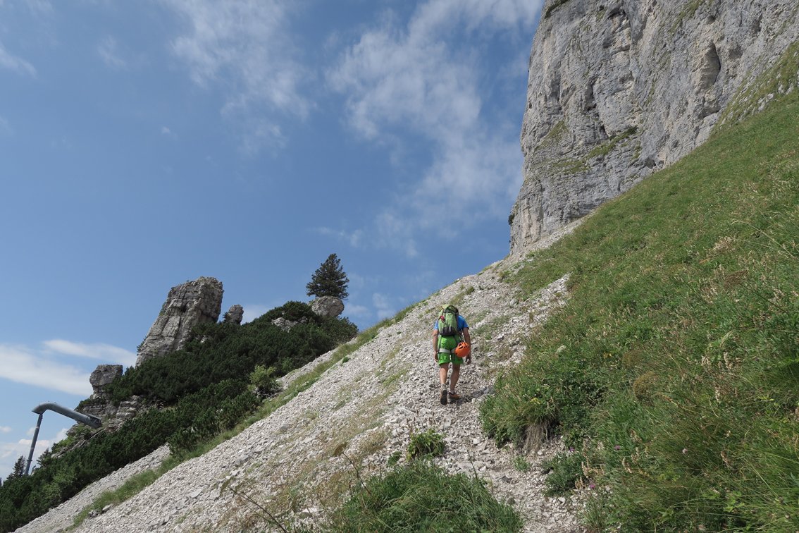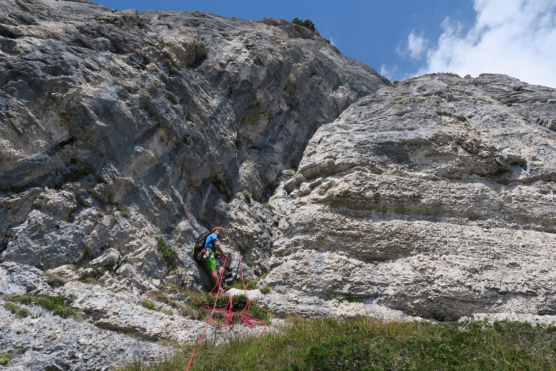 Vom Ausstieg folgt man dem Steig durch die Latschen bzw. der Kante entlang. In einem Sattel zweigt man dann rechts zum schon sichtbaren Wanderweg ab. Man geht am Ende über Wiesen gerade, leicht ansteigend zum Wanderweg, nicht rechts hinunter gehen! Man kann auch mit einem Doppelseil abseilen (siehe Topo).