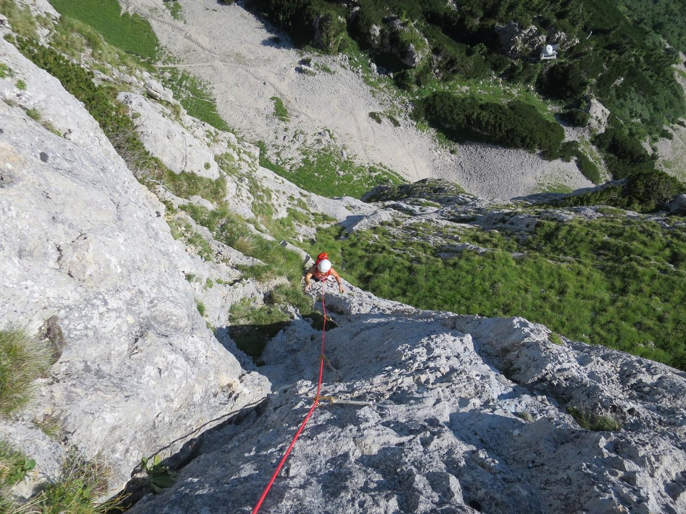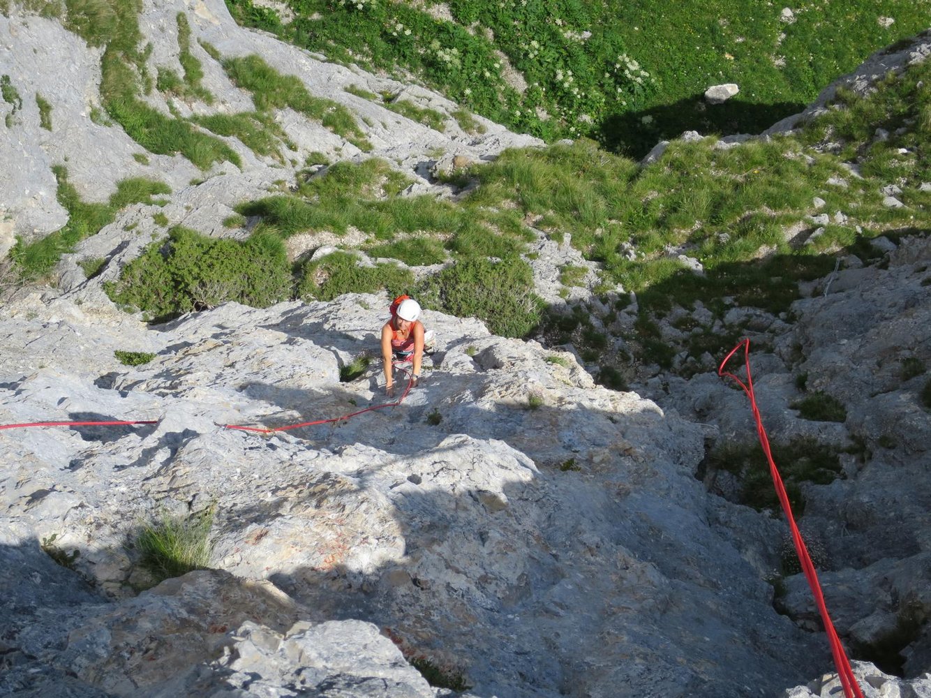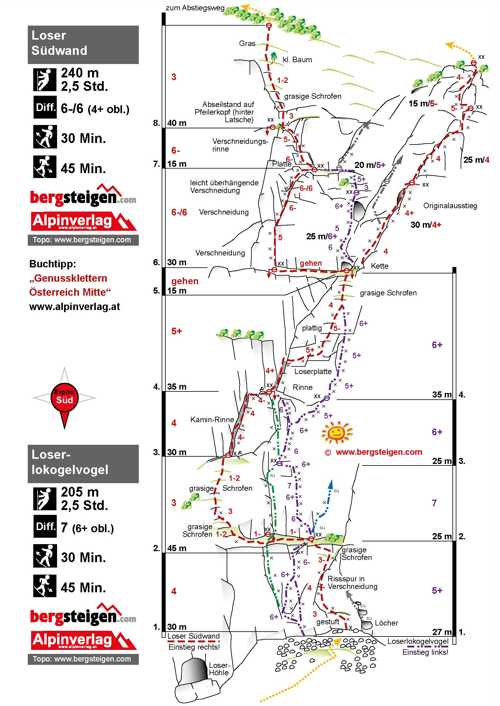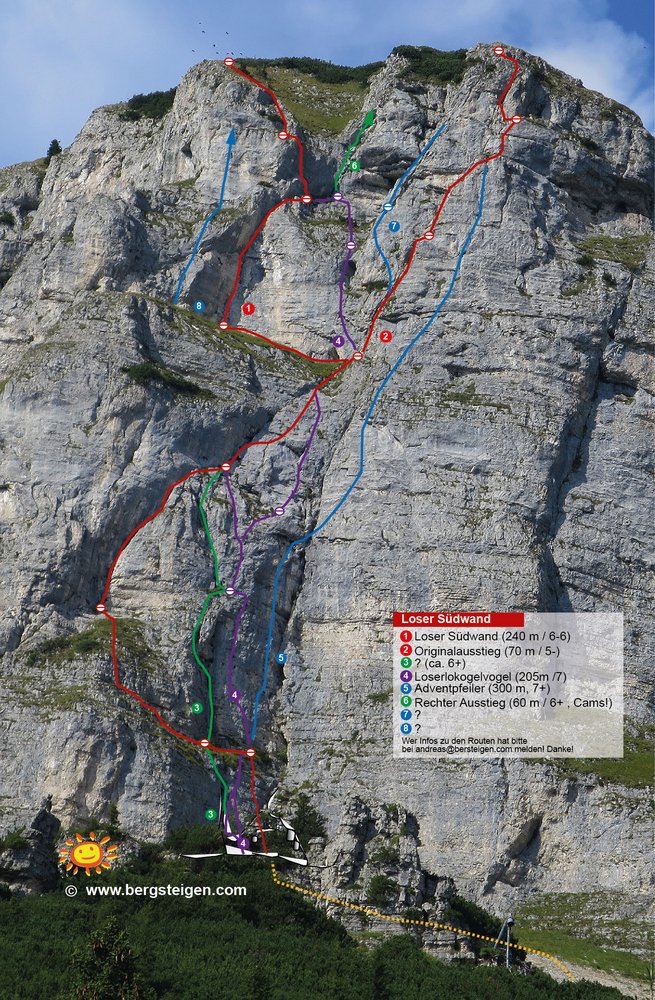 Schöne Bohrhakenroute in der Loser Südwand. Die Route endet eigentlich beim großen Band im letzten Wanddrittel, man kann aber noch gut eine 6er Länge anhängen, bevor man den letzten beiden Ausstiegslängen der Route „Südwand“ folgt. Der Fels ist bis zum Band sehr gut! Die Tour ist sehr gut mit Bohrhaken abgesichert, nur im leichten 2-3er Gelände steckt aber wenige.