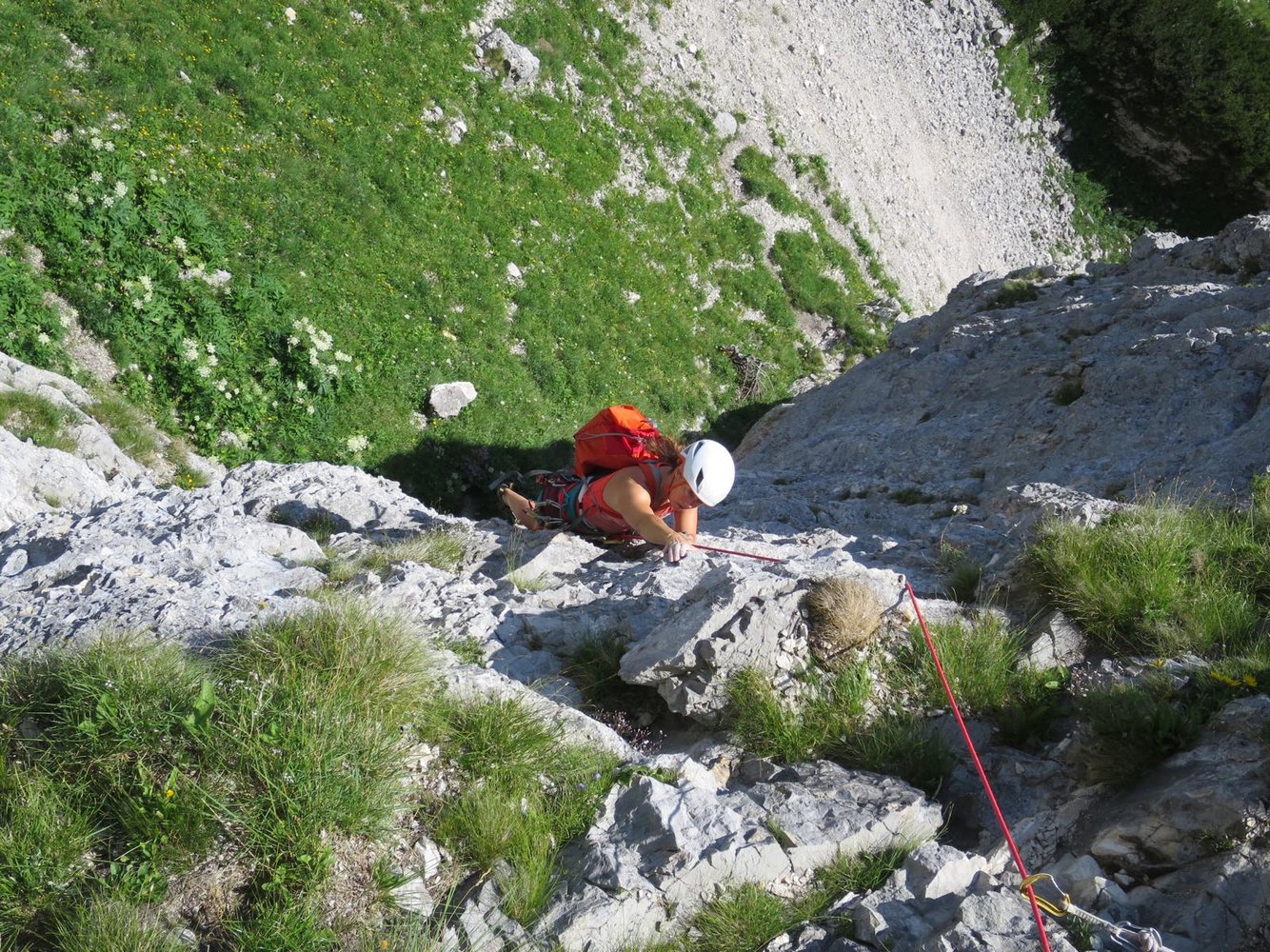 Vom Ausstieg folgt man dem Steig durch die Latschen bzw. der Kante entlang. In einem Sattel zweigt man dann rechts zum schon sichtbaren Wanderweg ab. Man geht am Ende über Wiesen gerade, leicht ansteigend zum Wanderweg, nicht rechts hinunter gehen! Man kann auch mit einem Doppelseil abseilen (siehe Topo).
