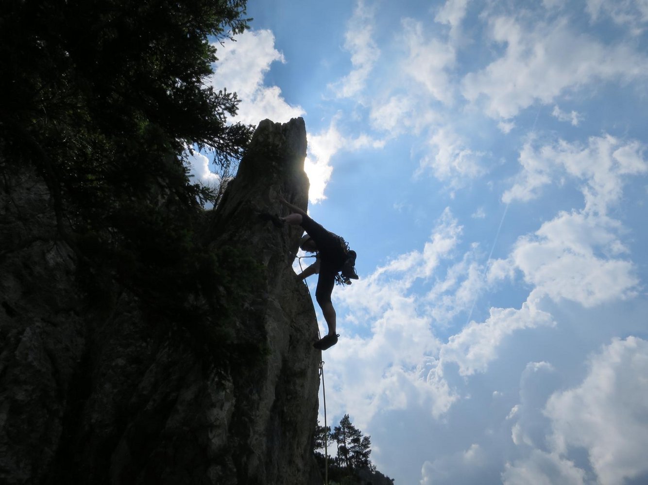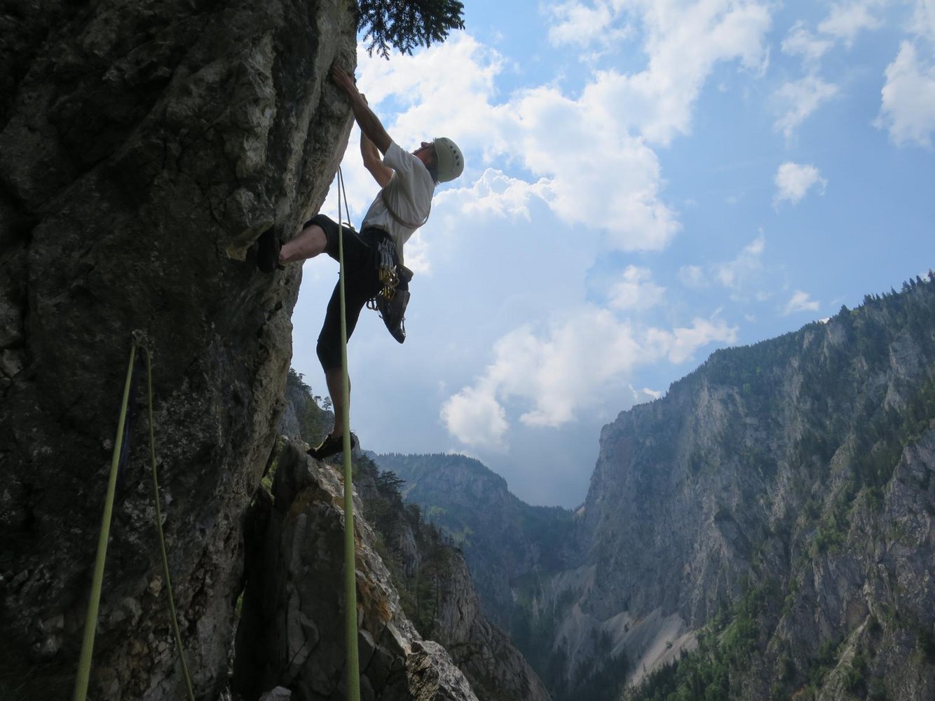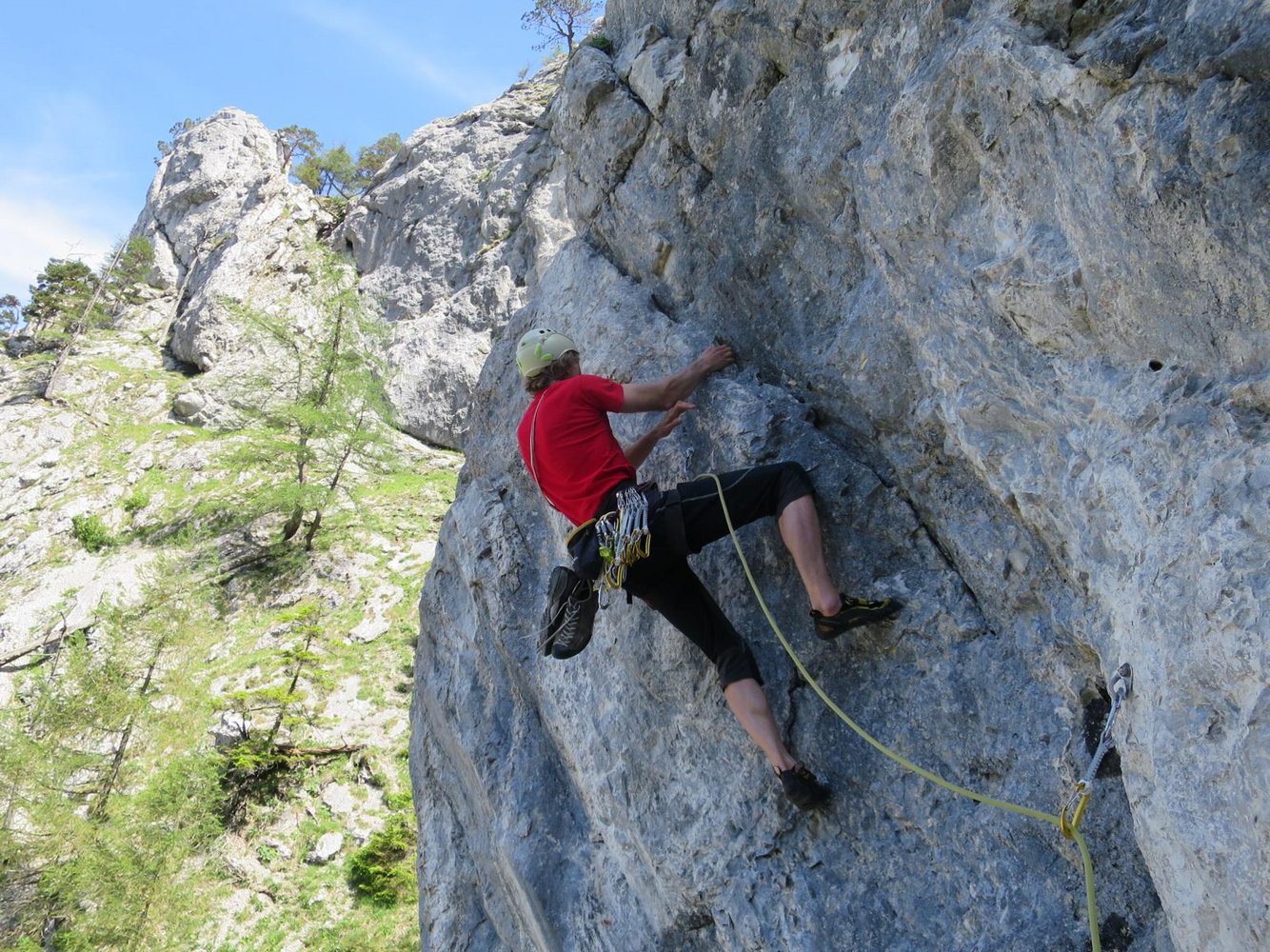 Der Fels ist raxtypisch oft splittrig und die 16. Länge hat Felssturzpotential; es ist aber alles perfekt mit Bohrhaken gesichert, lediglich in der 3. SL etwas weiter, was mit Friends gut entschärft werden kann. Dank der vielen Abbruchmöglichkeiten fehlt bei dieser Tour das alpine Flair.