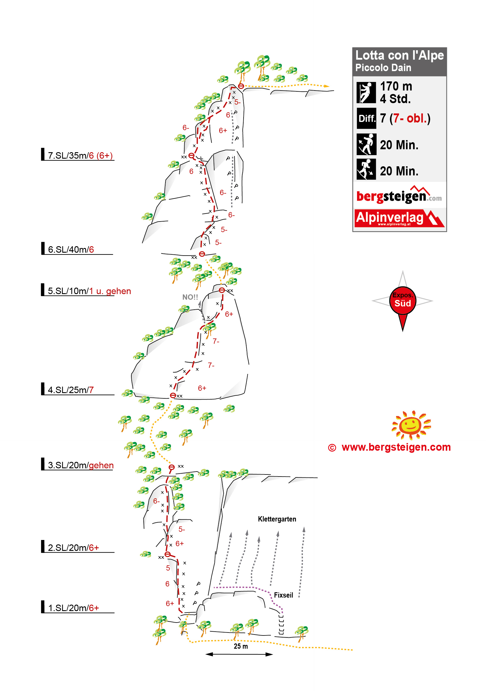 Die Lotta con l'Alpe ist eine schöne, aber etwas kurze Tour am Vorbau links unter dem wuchtigen Piccolo Dain. Die Tour besteht aus drei interessanten Abschnitten - dem steilen Beginn, dem anspruchsvollem Mittelteil und dem genussvollen Finale in Form einer schönen Verschneidung. Zu- und Abstieg sind kurz und die Absicherung ist perfekt. In Summe daher sehr zu empfehlen.