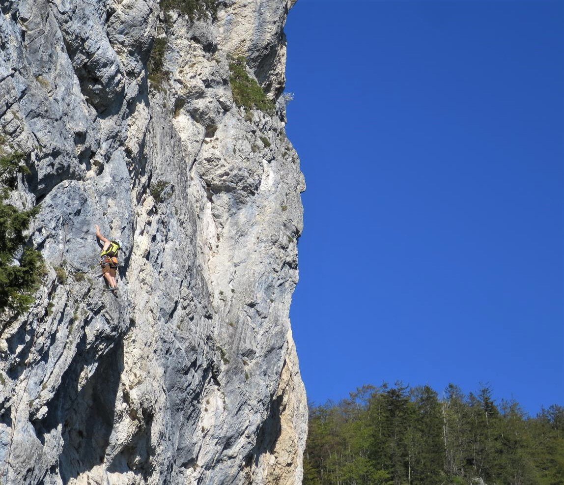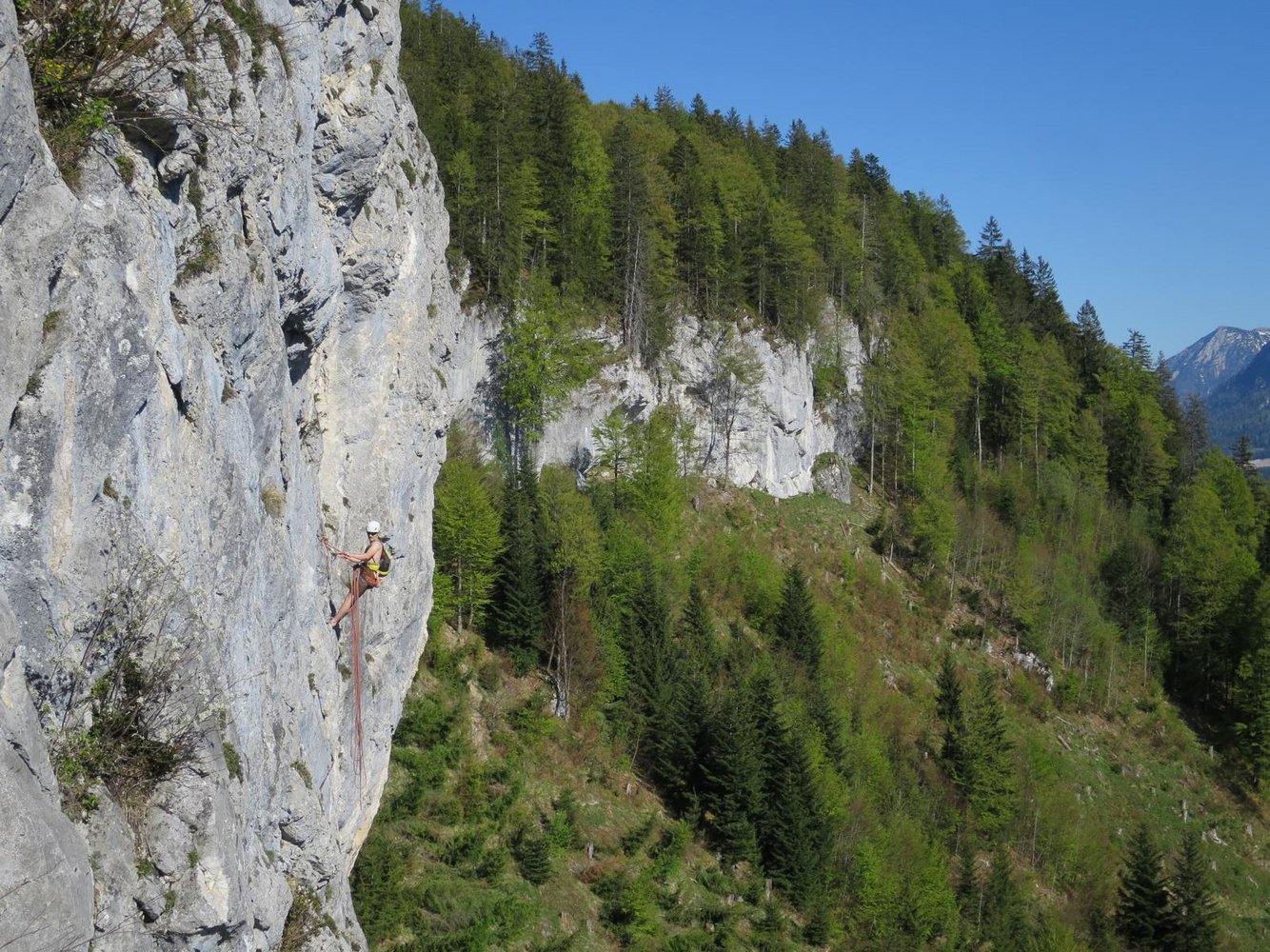 Sehr ausgesetzte Kletterei an gutem Fels und mit tollen Kletterzügen. Zuerst gemeinsam mit Faschingszug und in der 4ten Seillänge beim 3 BH in einer extrem ausgesetzten Querung mitten durch die Dächer nach rechts. Der Fels ist im oberen Teil etwas brüchig.