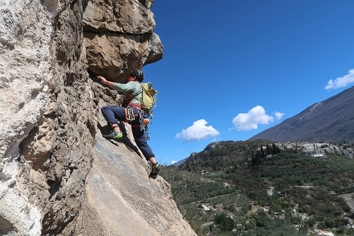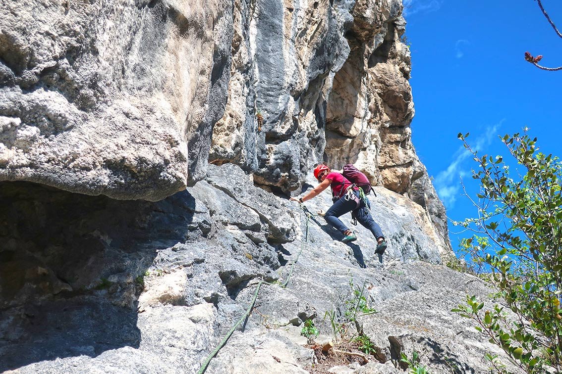 Die Klettertour ist im Kluckner/Grill-Stil abgesichert, gebohrte Sanduhren und Normalhaken.
