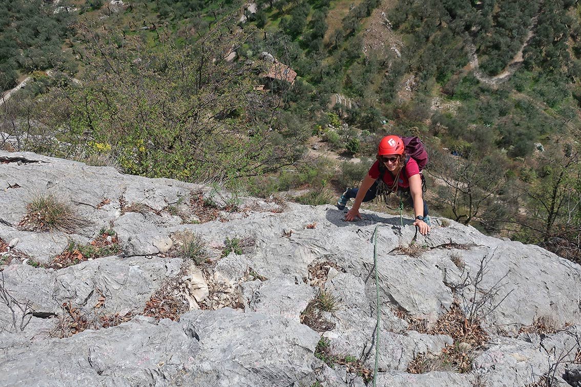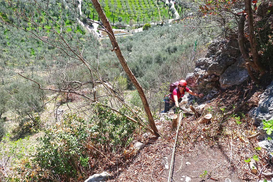 Vom Ausstieg ein paar Meter nach hinten zum mit roten Punkten markierten Abstiegspfad, auf diesem nach links in einen Sattel, dort rechts auf Pfadspuren hinunter zu den Olivenhainen, dort links um die Kante herum zum schon bekannten Zustiegsweg und auf diesem zum Ausgangspunkt absteigen.