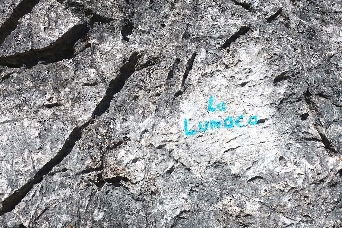Die Route Lumaca (das heißt Schnecke) ist eine kurze Mehrseillängentour im linken Wandteil der Wände am Monte Baone. Die Tour ist einen wenig inhomogen, unten 2 leichte Seillängen, dann eine scharfe Ecke und am Ende eine etwas gefährliche Ausstiegsseillänge. Als kurze Tour für den An- oder Abreisetag bzw. als Zweitroute an den Baone Felswänden zu empfehlen - als eigenständiges Kletterziel aber nicht so interessant.