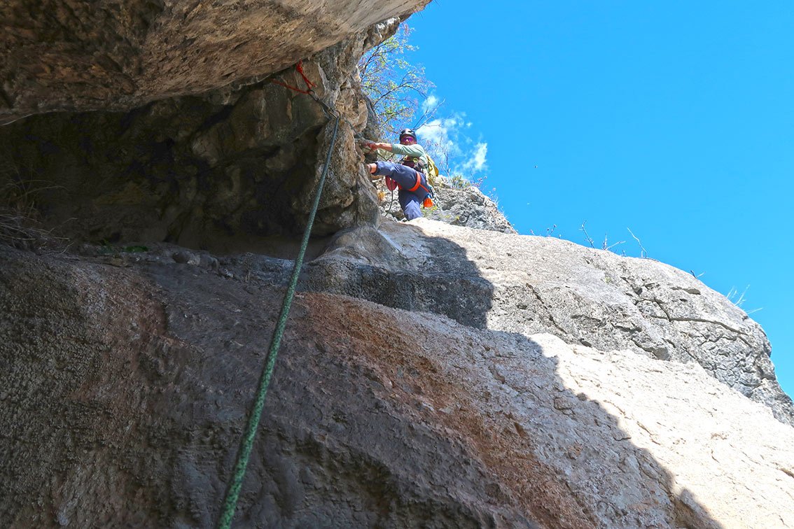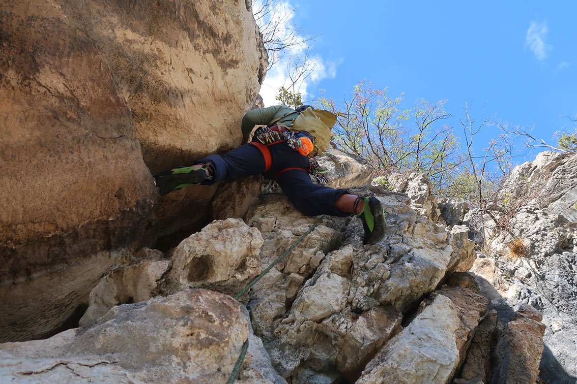 Die schwere Passage an einer Ecke in der 3ten Seillänge.
