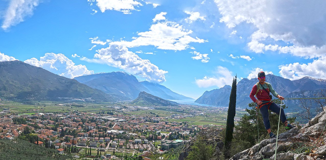 Von Rovereto oder Trento nach Arco. Im Ort hinter dem markanten Burgfelsen ins Lagheltal, nach den ersten engen Kehren kommt ein Parkplatz in der Mitte - genau dort wo sich die Straßen per Einbahnregelung teilen. Öffis: Mit dem Bus nach Arco und weiter zu Fuß.