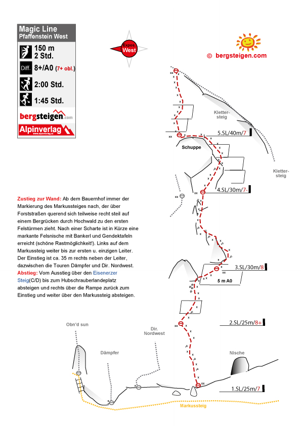 Ab dem Bauernhof immer der Markierung des Markussteiges nach, der über Forststraßen querend sich teilweise recht steil auf einem Bergrücken durch Hochwald zu den ersten Felstürmen zieht. Nach einer Scharte ist in Kürze eine markante Felsnische mit Bankerl und Gendektafeln erreicht (schöne Rastmöglichkeit!). Links auf dem Markussteig weiter bis zur ersten u. einzigen Leiter. Der Einstieg ist ca. 35 m rechts neben der Leiter, dazwischen die Touren Dämpfer und Dir. Nordwest.