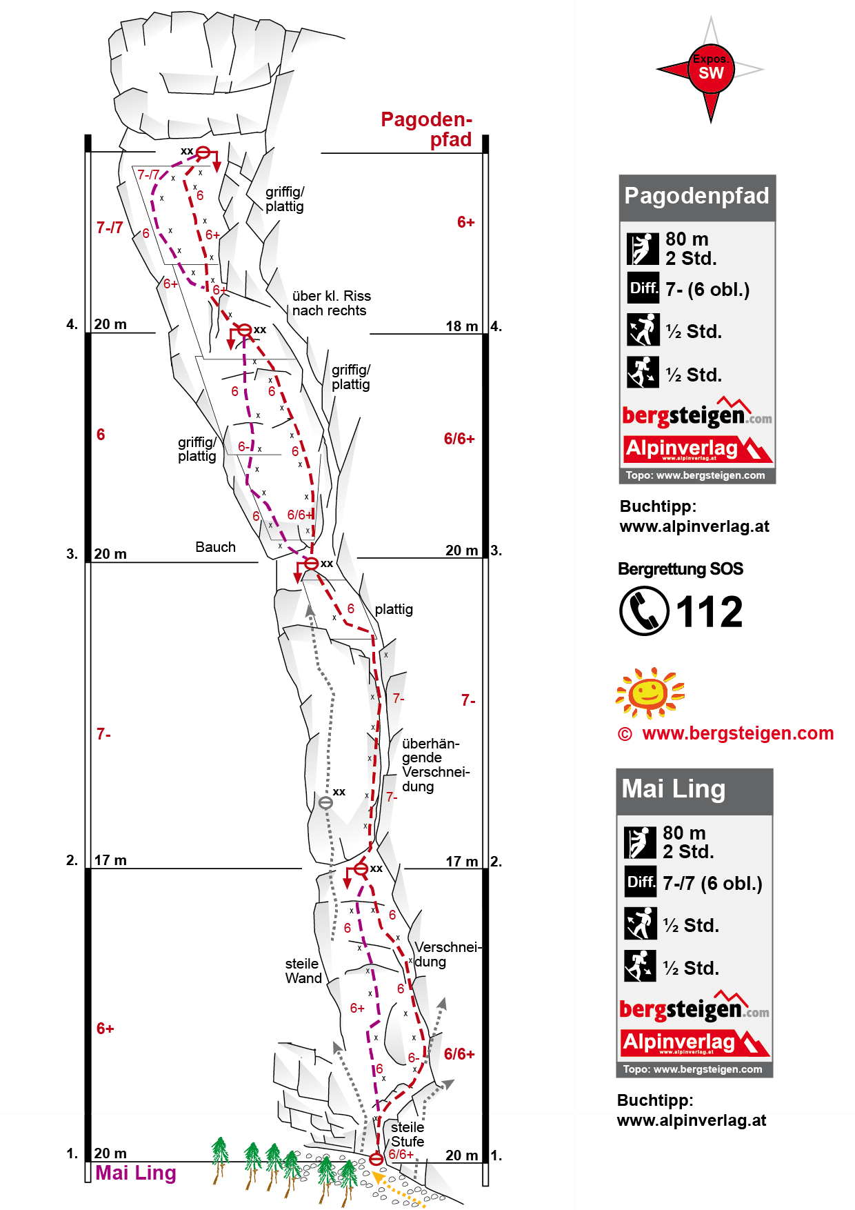 Der „Pagodenpfad“ ist eine Variante von „Mai Ling“ und gehört zu den ältesten Routen im Klettergarten Chinesische Mauer. Die unteren zwei beiden Seillängen der Routen werden von den Klettergarten-Kletterern gerne zum Aufwärmen verwendet, mit einem 80-m-Seil ist das möglich. Dementsprechend ist die halbe Route bereits glatt poliert. Die Schwierigkeiten sind die überhängende Verschneidung in der zweiten Seillänge und die letzten Meter der Route „Mai Ling“ vor dem obersten Standplatz. Die oberen Seillängen bieten wahrlich noch perfekten, rauen, erodierten Tropflochfels!