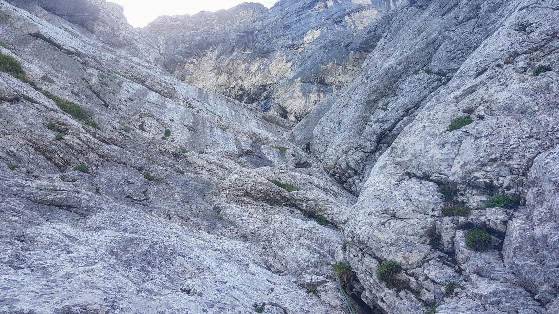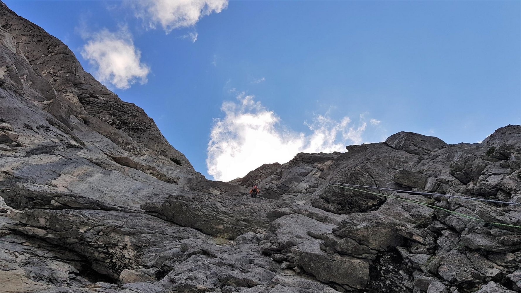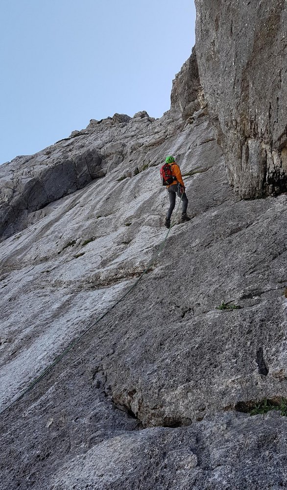 Bis in den untern 6. Schwierigkeitsgrad weite Hakenabstände. Die 3. Seillänge lässt sich gut selbst absichern. Die beiden Seillängen im 7. Grad sind sehr gut mit Bohrhaken ausgestattet. Trotz der Sanierung immer noch ein alpiner und ernster Anstieg.