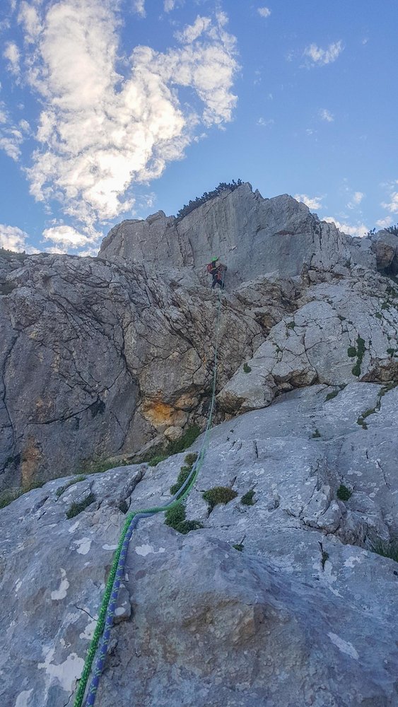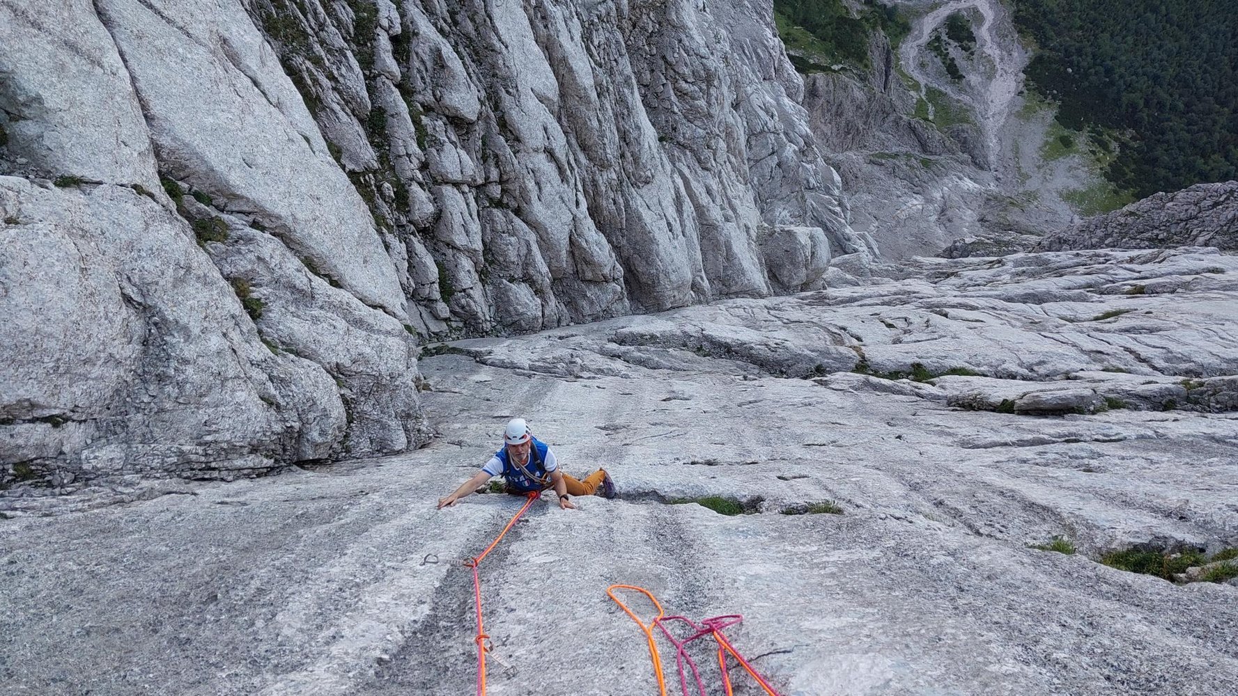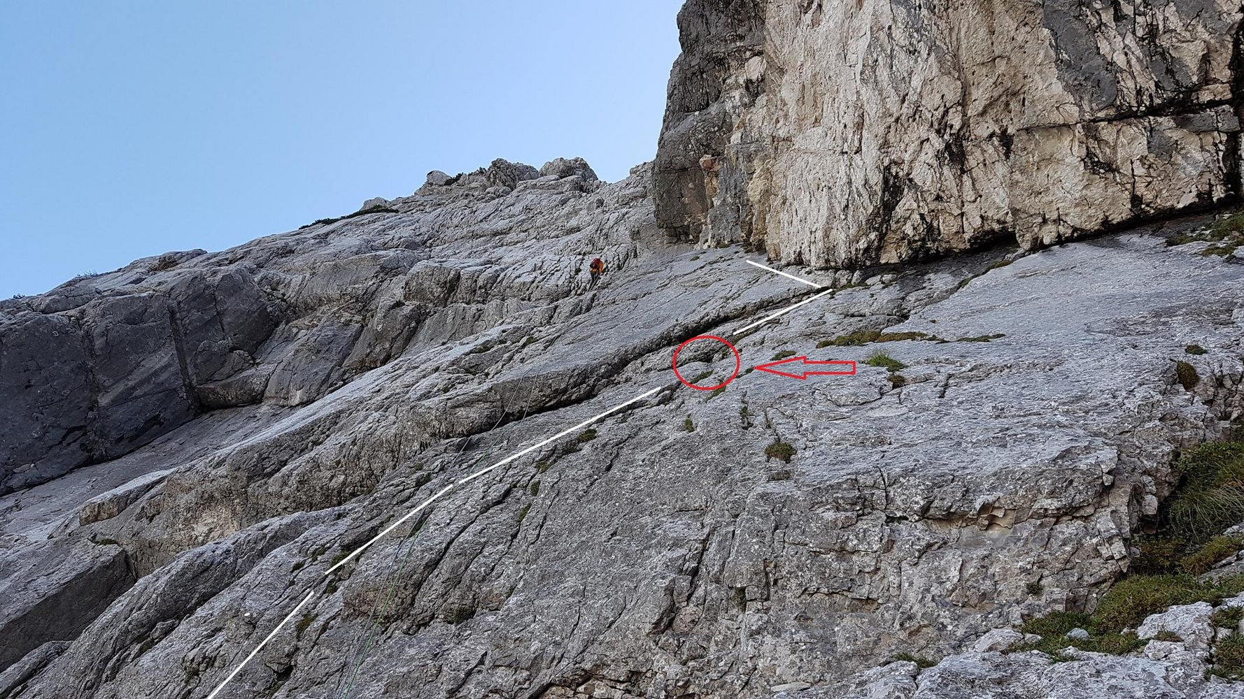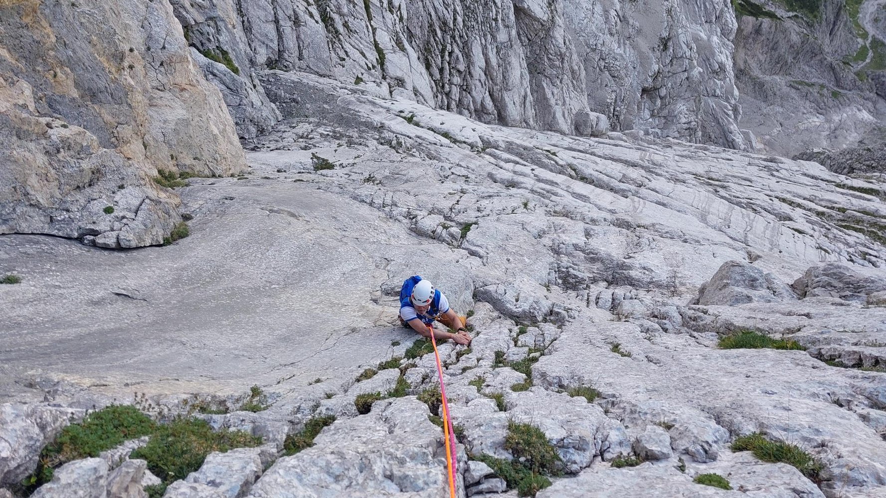 Bis in den untern 6. Schwierigkeitsgrad weite Hakenabstände. Die 3. Seillänge lässt sich gut selbst absichern. Die beiden Seillängen im 7. Grad sind sehr gut mit Bohrhaken ausgestattet. Trotz der Sanierung immer noch ein alpiner und ernster Anstieg.