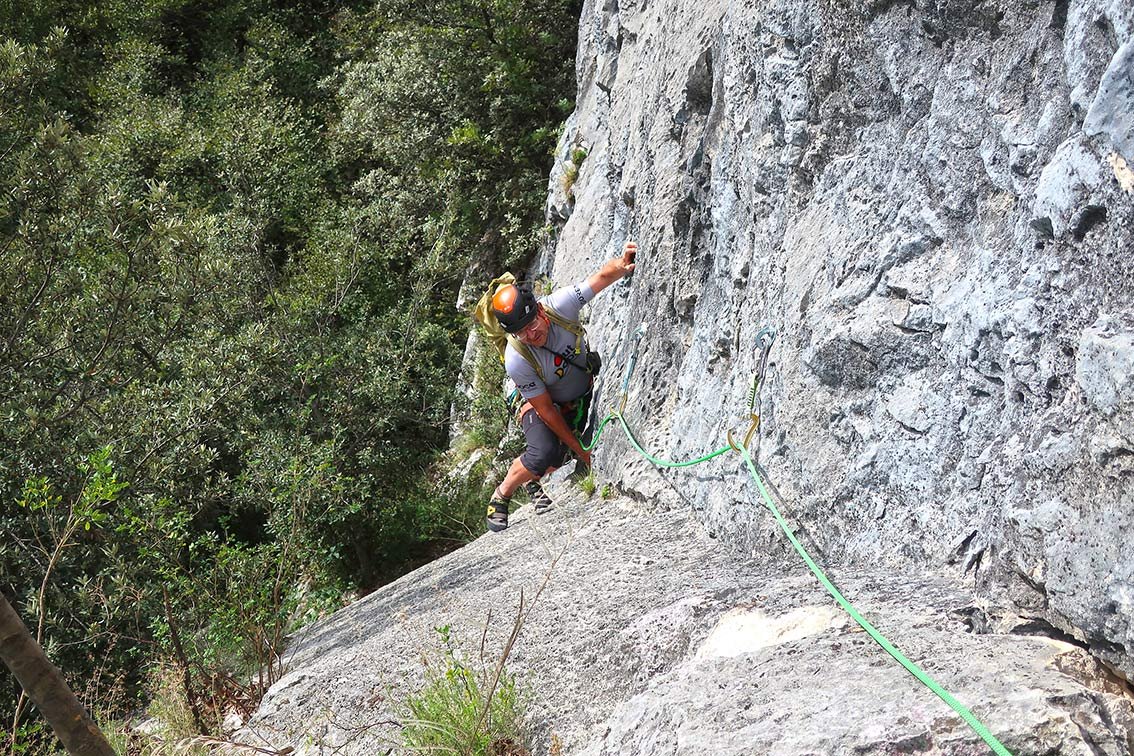 Vom Parkplatz zur römischen Brücke und von dieser links in Richtung Monte Colt. Gleich nach den Oliven-Terrassen aber nicht rechts weiter, sondern gerade auf dem Forstweg in den Wald. Nach wenigen Minuten zweigt rechts ein Pfad ab, dem man aufwärts bis zum Klettergarten folgt. Vom Klettergarten der Wand entlang bis zum Einstieg in einer Ecke am rechten Rand eines Klettergartens (Einstieg ist angeschrieben).
