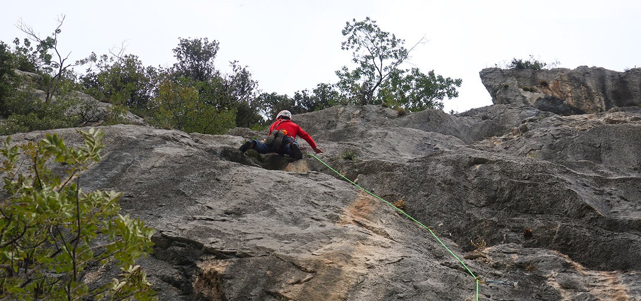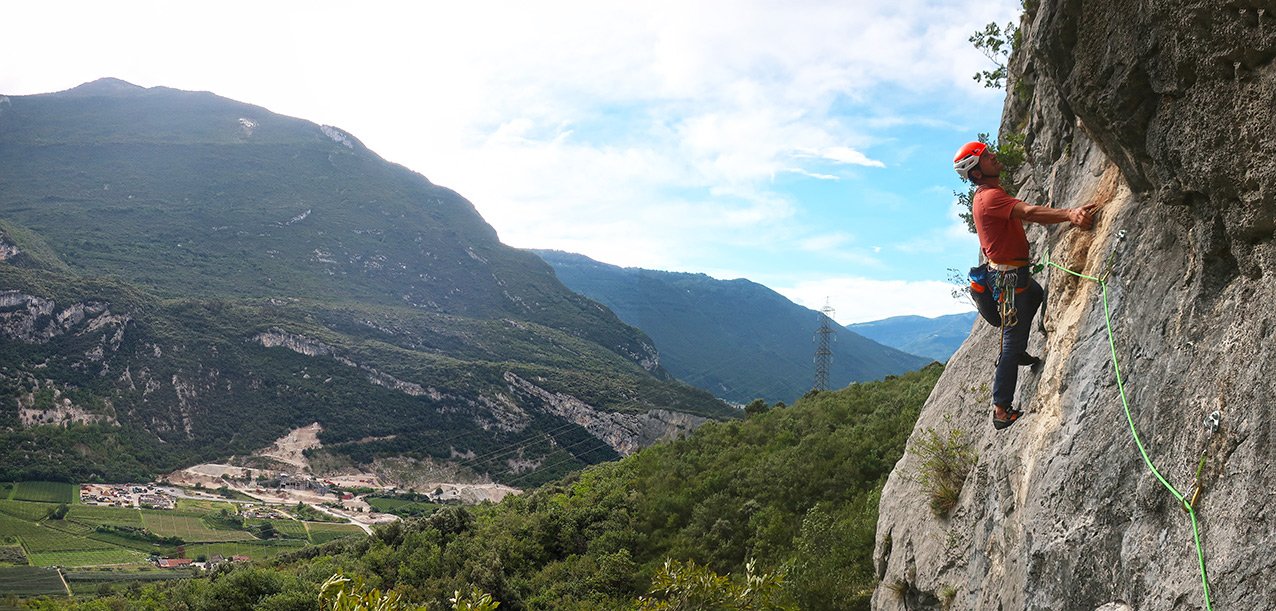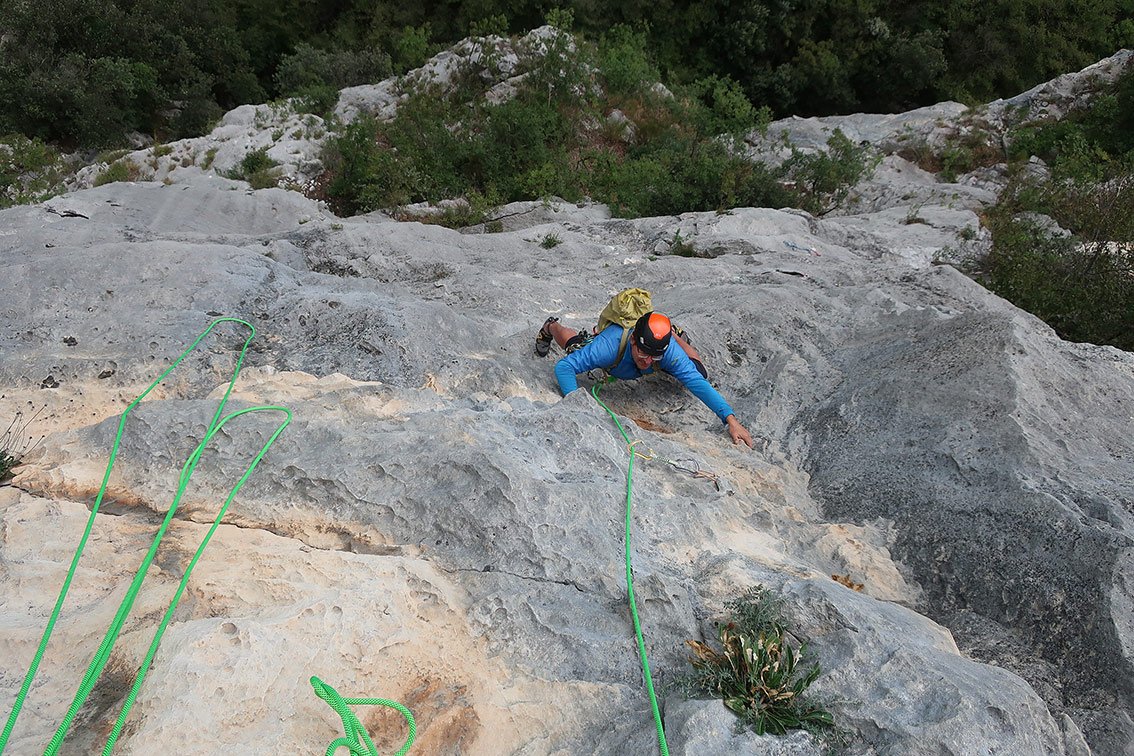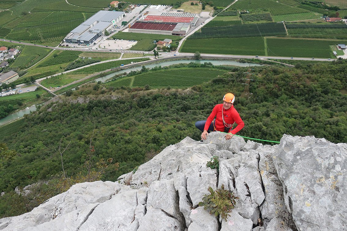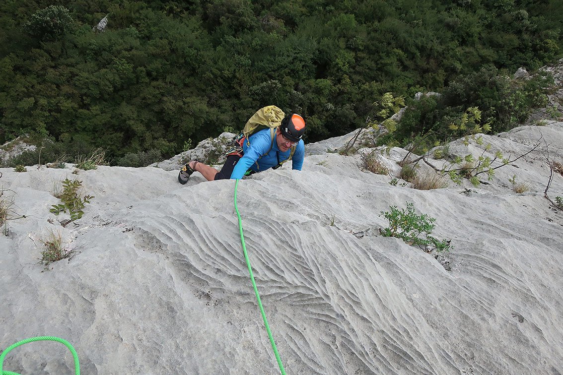 Die Route Manuines ist ein vertikales, recht ausgesetztes Sahnehäubchen an der Ostwand unterhalb des Croce di Ceniga. Der Anstieg schlängelt sich geschickt durch die steile Wandzone, überhängende Passagen werden mit luftigen, aber gut zu kletternden Querungen überbrückt. Oft schaut man ungläubig nach oben zu den Bohrhaken, um wenig später festzustellen, dass man doch recht gut durch die steile Felswand kommt. Eine wirklich gelungene, recht exponierte Route, die man auf jeden Fall einmal gemacht haben muss!