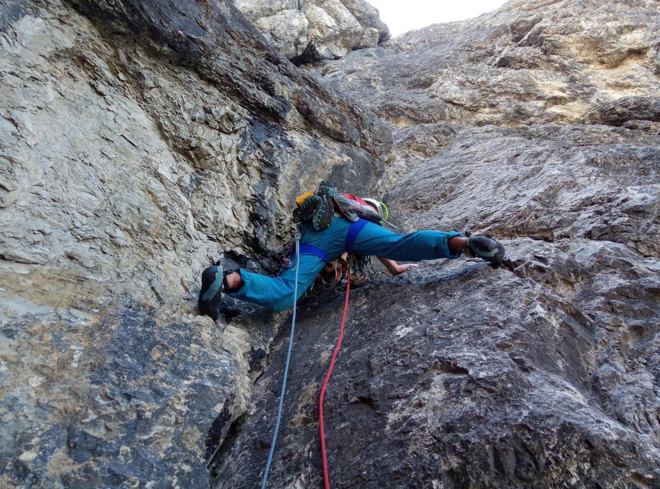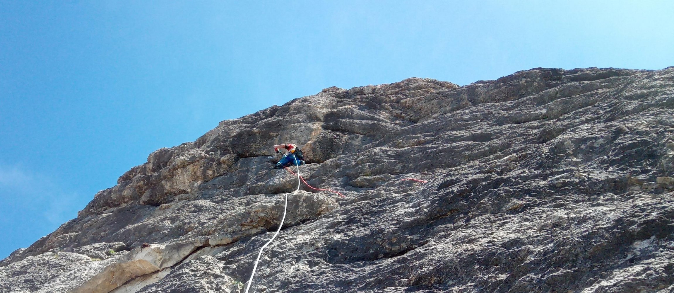 Die Absicht war, eine Route mit Bohrhaken zu eröffnen, wobei man doch weite Strecken im klassischen Gelände selbst absichern muss. Also keine Plaisierroute im herkömmlichen Sinn. Die Standplätze richteten wir jeweils mit Bohrhaken aus. An den Stellen wo Risse und Verschneidungen das Anbringen von mobilen Sicherungen erlaubten, verzichteten wir großteils auf das Bohren von Zwischenhaken. Auf diese Weise ist ein Sortiment Friends erforderlich. Insbesondere in den Seillängen Nr. 4,5 und 6 hat die Route klassischen Charakter und Linienführung. Die 7. Seillänge ist die Schlüsselstelle, die zwingend frei geklettert werden muss. Trotz einiger Bohrhaken sollte man recht konzentriert und vorsichtig über den bauchigen Wulst klettern. Nach dem grasigen Band gibt es zum Ende noch eine lohnende letzte Seillänge in sehr gutem Fels.