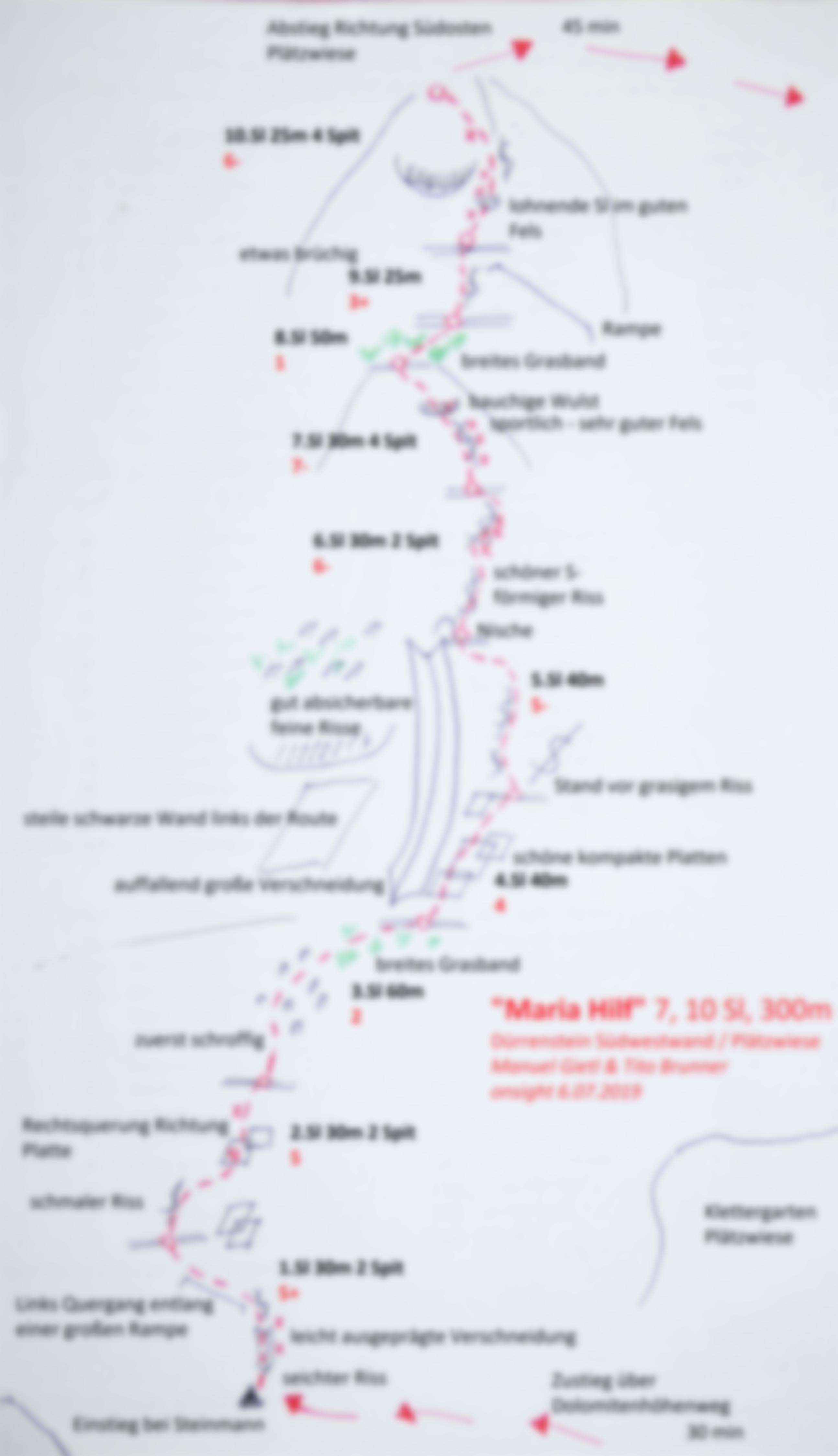 Dürrenstein Südwestwand? Ja die gibt es wirklich. Nachdem ich mit einigen Freunden Ende Juni vom Klettergarten Kirchler im Pragstertal zurück zum Parkplatz Plätzwiese ging, fiel mir auf, dass zwischen dem Klettergarten Plätzwiese und Kirchler noch einiges an unberührten Felsenland vorhanden ist. Auf den ersten Blick zwar wenig spektkulär, aber mit etwas Fantasie und Kreativität bastelte ich mir bereits eine mögliche Linie im kopf zusammen. Wenige Tage vergingen und am darauffolgenden Wochenende stand ich mit Tito Brunner voll motiviert am Einstieg. Der Zustieg gestaltete sich schon sehr unkompliziert. Entlang des Dolomitenhöhenweges geht man zuerst am Klettergarten Plätzwiese vorbei und quert kurz nachher in nördliche Richtung zum Einstieg.