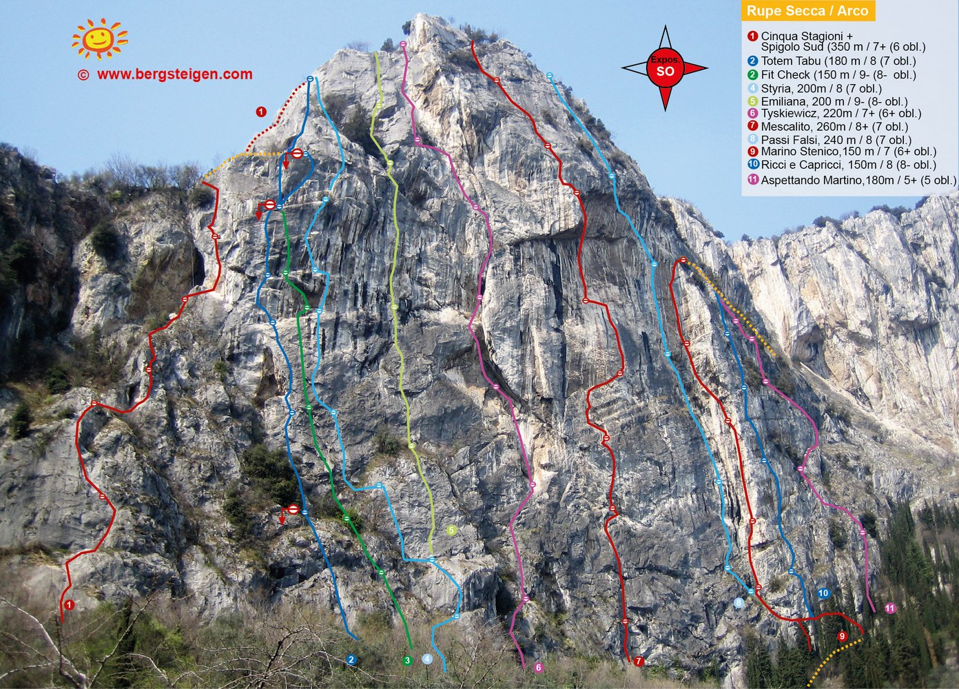 Die Route Marino Stenico ist ein schöner, zu Unrecht etwas selten besuchter Klassiker am Rupe Secca. Die Route bietet athletische Verschneidungskletterei an noch nicht so abgespecktem Fels. Sollte man gemacht haben!