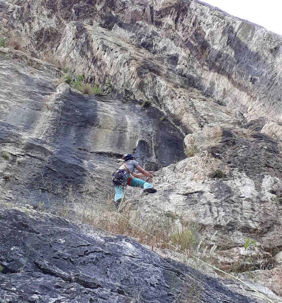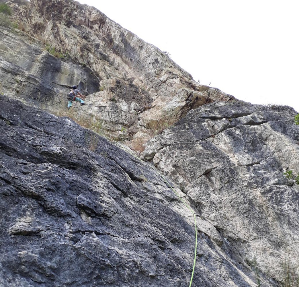 Grasige und schrofige Verschneidung hoch. Man sieht dann schon den Stand der anderen Tour! (man kann auch hier Stand machen, dann sieht man den Kletterer besser). Sonst noch an kleiner Rampe rechts hoch, dann Stand an 2 BH ( in einem hängt ein rostiges Kettenglied).