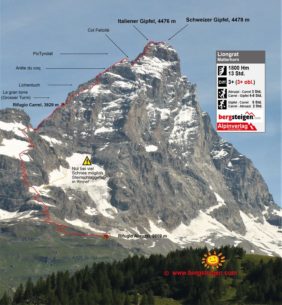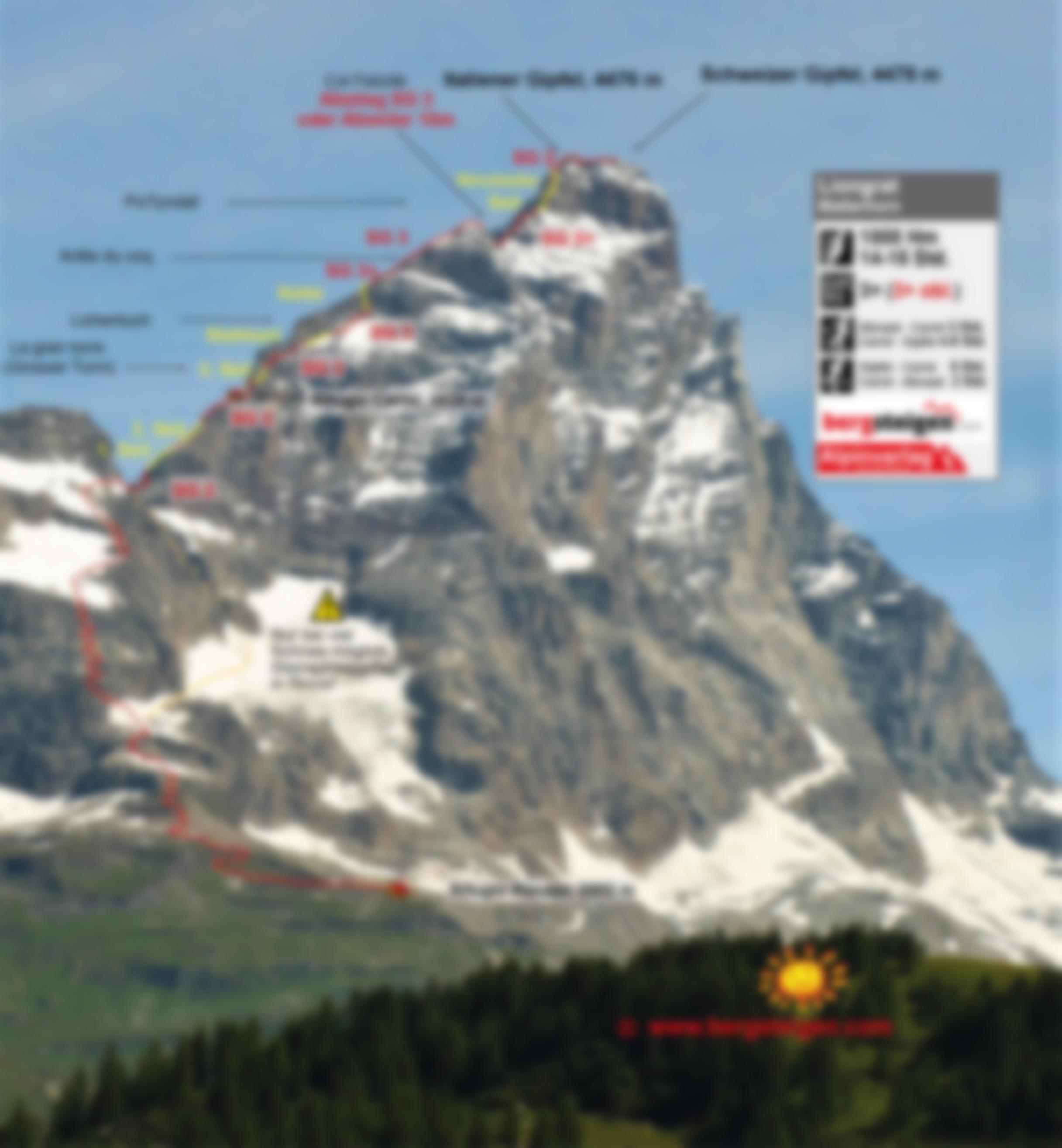 Hinter der Abruzzi Hütte an einem Teich vorbei zum „Croce Carrel“. Weiter im zick- zack über Felsen und Geröll (immer leichte Steigspuren erkennbar) zum ersten Schneefeld. Dieses geradlinig hinauf und über ein verdecktes Couloir in leichter Kletterei weiter und über zwei nachfolgende Schneefelder unter dem Grat steil nach oben. Eine steile Flanke fast horizontal queren zum eigentlichen Grat- Colle del Leone- unter dem Carrel Biwak. Auf Steigspuren durch Schotter zum ersten Kletteraufschwung mit einem dicken Seil. Am Carrel Biwak vorbei (2 bis 3 Stunden ab Abruzzi) und dann im Wesentlichen immer orografisch links des Grates in der Südwand Höhe gewinnen. Ab den Stahlketten dann immer am Grat bis zum Pic Tyndall (4.241 m). Rüber zur Schlusswand über eine kurze Abkletterstelle (SG III) und diese über Hilfsseile und einer Strickleiter zum Italiener Gipfel (4.476 m). Über den ausgesetzten Grat in östlicher Richtung zum Schweizer Gipfel auf das Matterhorn (4.478 m- 3 bis 4 Std ab Carrel Biwak).