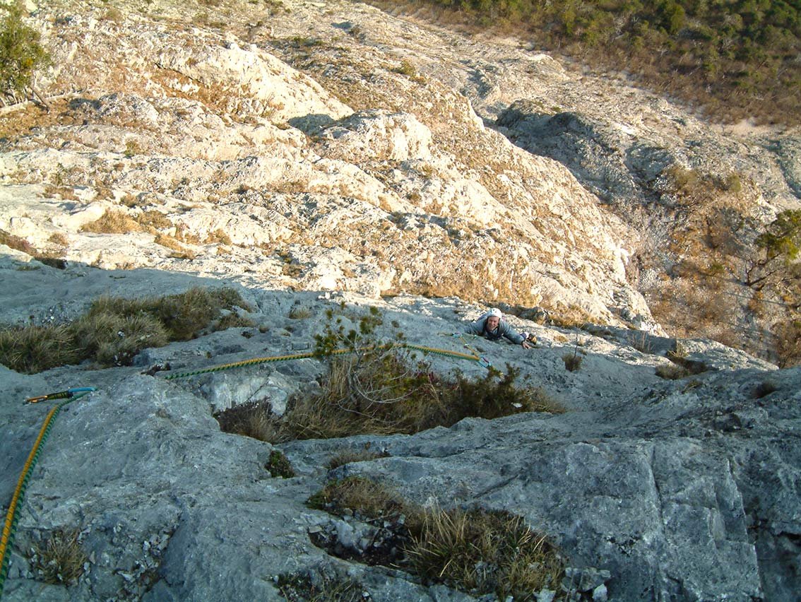 Vom Parkplatz am WC vorbei zum „Alpinmagazin“ (Klettergarten mit markanter Wasserrille), danach links haltend hinauf (Sammelabstieg), bis man auf ca. 800 m zum Ostrissband (Pfadspuren, leicht markiert) quert - also auf den Abstieg der Vorbau-Klettertouren aufsteigt. Viel besser ist es aber, eine der Vorbautouren hinauf zu klettern - z.B. „Rucola“.