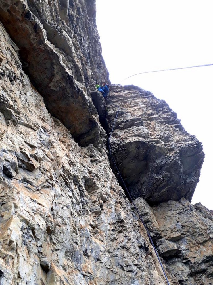 1 SL: 20 m, 7+, 5 BH. Zuerst leicht nach links klettern und dann in die kompakte, schwarze Verschneidung hoch. Stand am Ende der Verschneidung rechts in Nische.