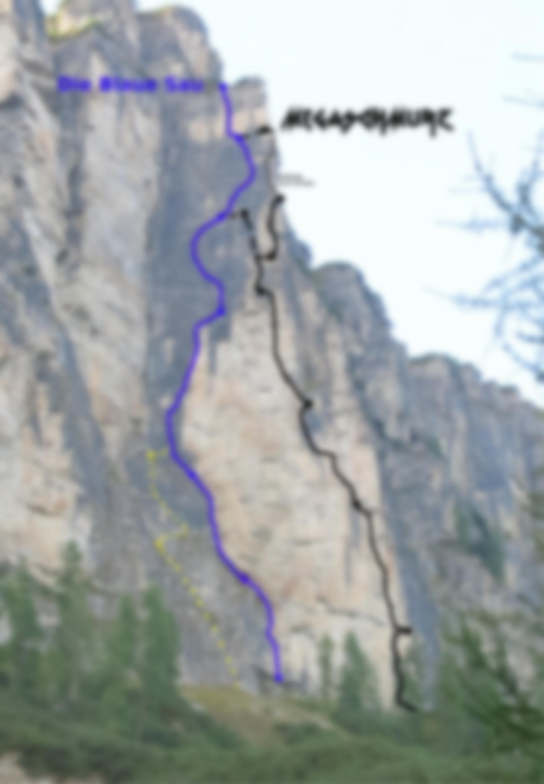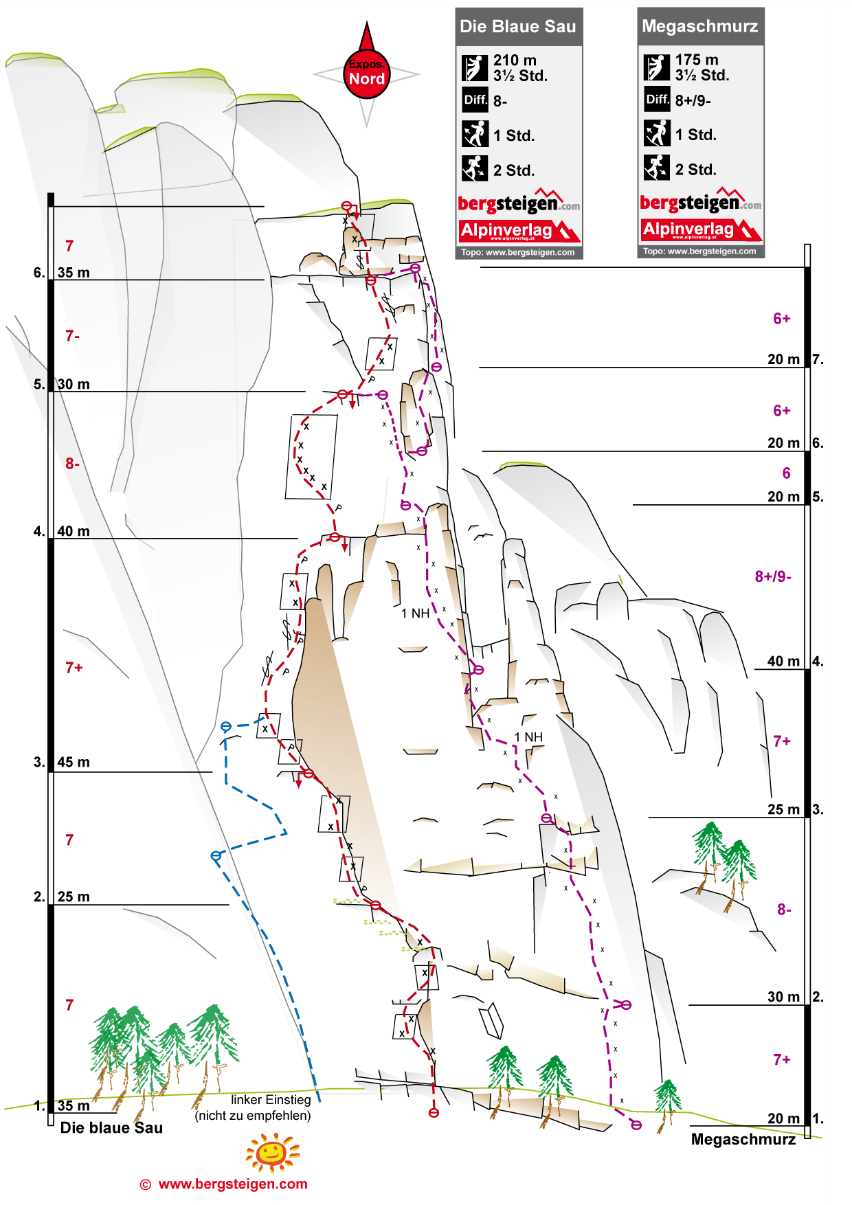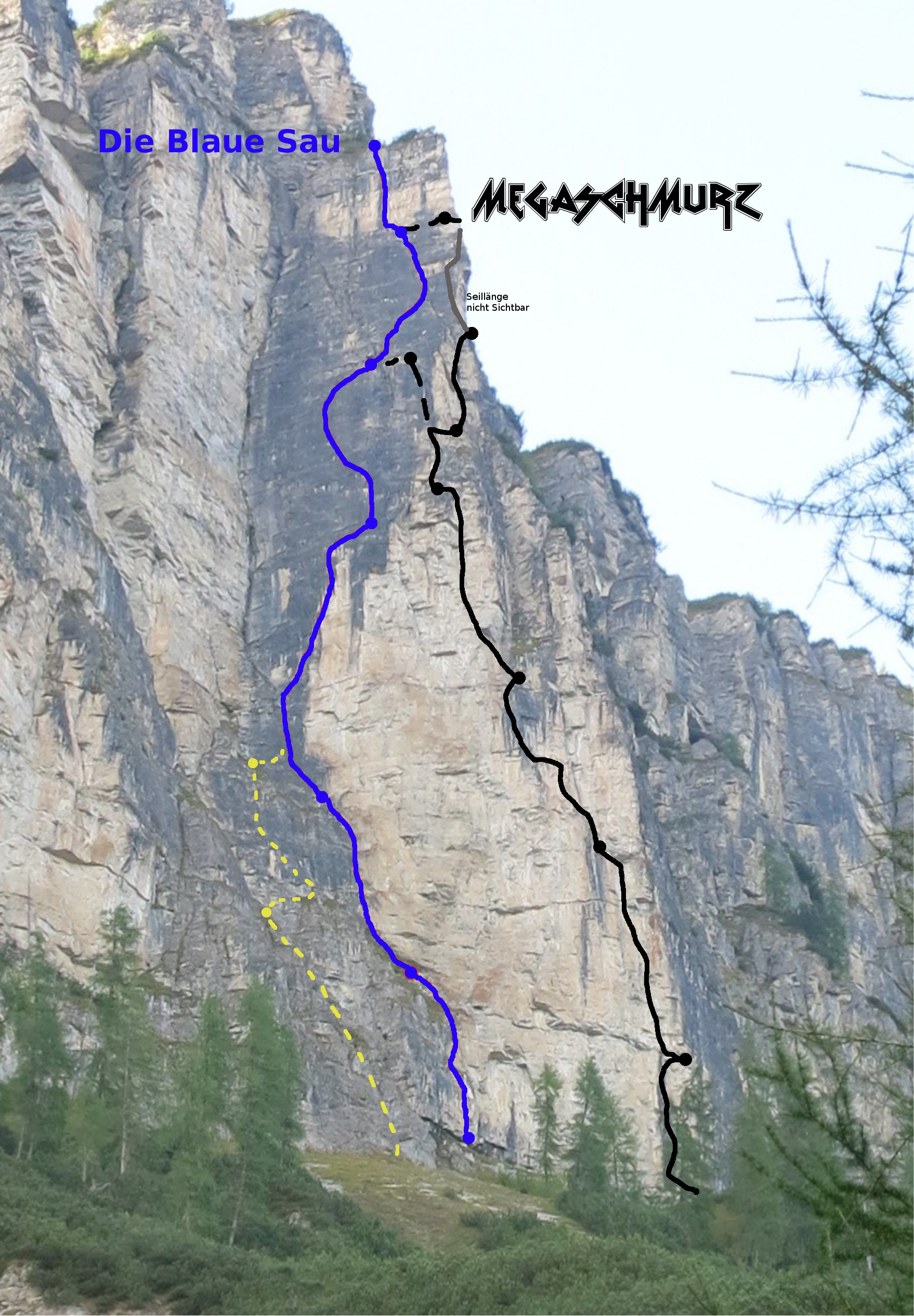 Einstieg: ca. 100 m rechts von "Die Blaue Sau". Am rechten Rand der Wand, mit Steinmann markiert, BH sichtbar.