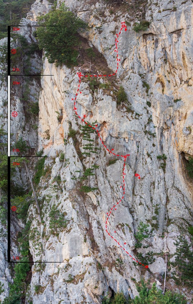 Kurze, aber überraschend abwechslungsreiche Tour mit kleinem Überhang, Plattenstelle und ausgesetzter Verschneidung. Damit ist auf 3 Seillängen für jeden etwas dabei. Großzügig abgesichert – lässt sich hervorragend mit der Tour " > Eleganz im Meerschweinchentanz" (rechts daneben) verbinden. Die Tour ist unmittelbar links neben "Die Eleganz im Meerschweinchentanz".
