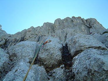 Tolle und auch extrem gut abgesicherte Route im besten Kaiserfels. Nach einer Einsstiegslänge über Gletscherschliff und riesen Wasserrillen führen zwei super Plattenlängen zur Schlüsselseillänge, die dann noch etwas steiler ist.