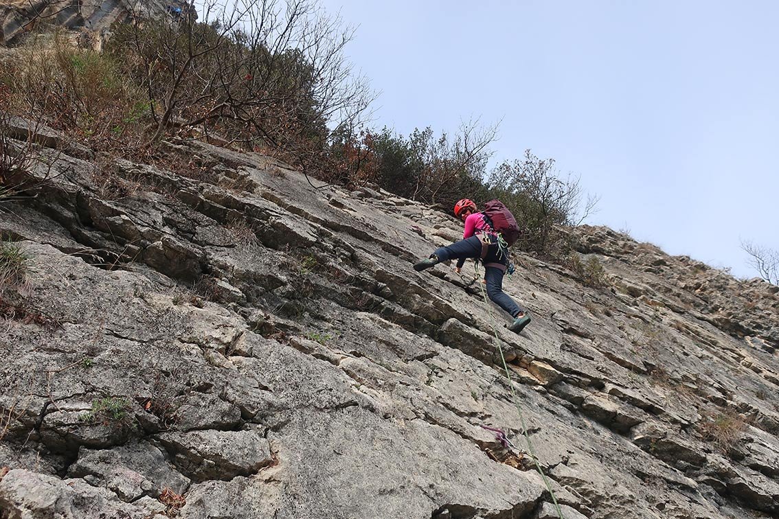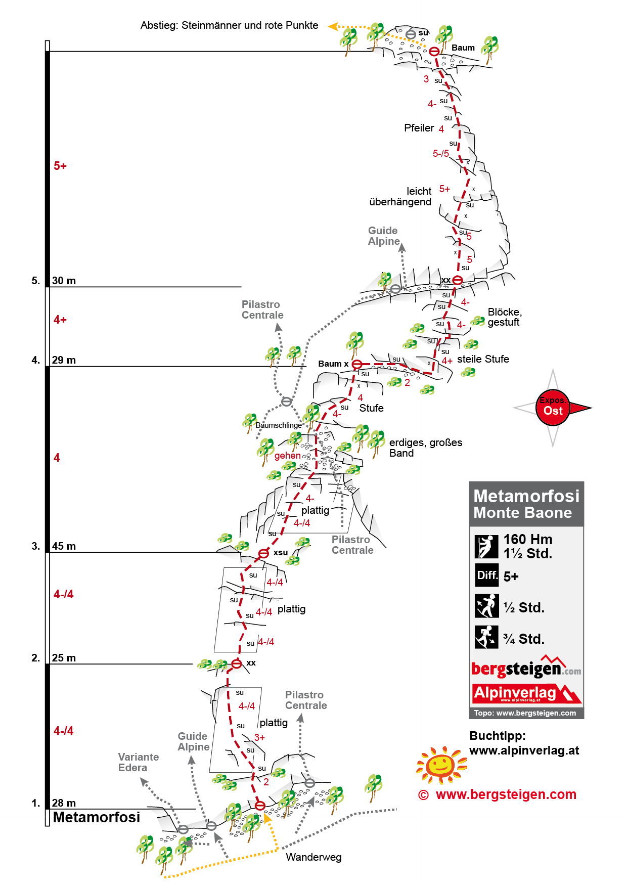 Tipp: Man steigt etwas entlang der Felskante ab (blasse Markierung), dann muss man eine leichte Felsstufe in eine Art Rinne abklettern (auf der anderen Rinnenseite ist ein Felspfeiler, dort ist der Ausstieg der Via Edera), dann die Rinne, welche zur originellen Schlucht wird, südlich absteigen (zwei kurze Stufen müssen abgeklettert werden, ca. 1+; bei Nässe heikel). Unten, am Ende der Schlucht, dann rechts wieder zum weiteren Abstiegsweg. Siehe dazu Übersichtsbild.