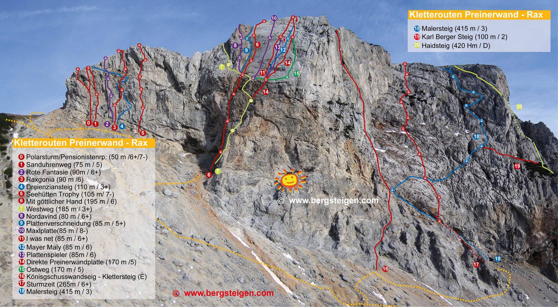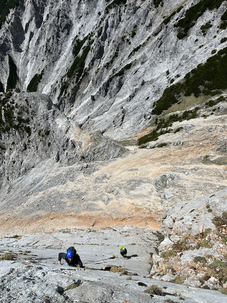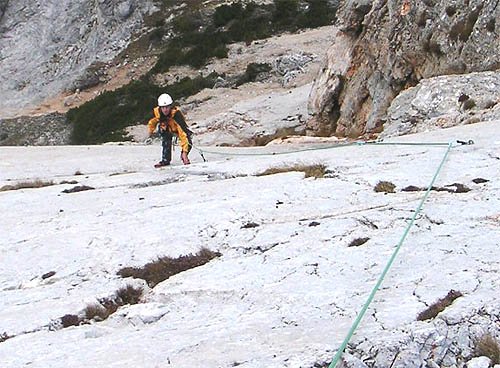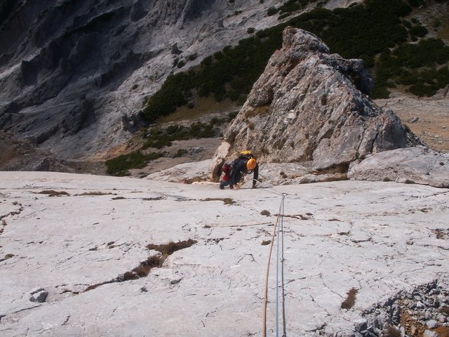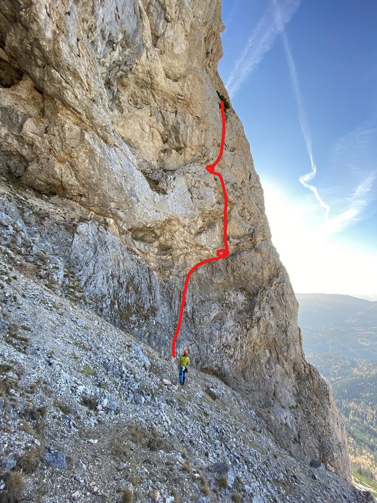 Diese Route in der Preinerwand ist sicher eine der besten Genuß-Touren im Raxbereich. Sie ist durchaus mit dem King Kong Koarl zu vergleichen, zumindest was die Absicherung betrifft. Die Route verläuft im unteren Teil durch nicht sehr festes Gestein (Helm!!!), dafür wird man aber oben durch wunderschöne Platten, die man nur durch "Handauflegen" überwindet, entschädigt. Danach lohnt sich ein Besuch der Seehütte, der nette Wirt winkt eh immer mit dem Bier hinüber...