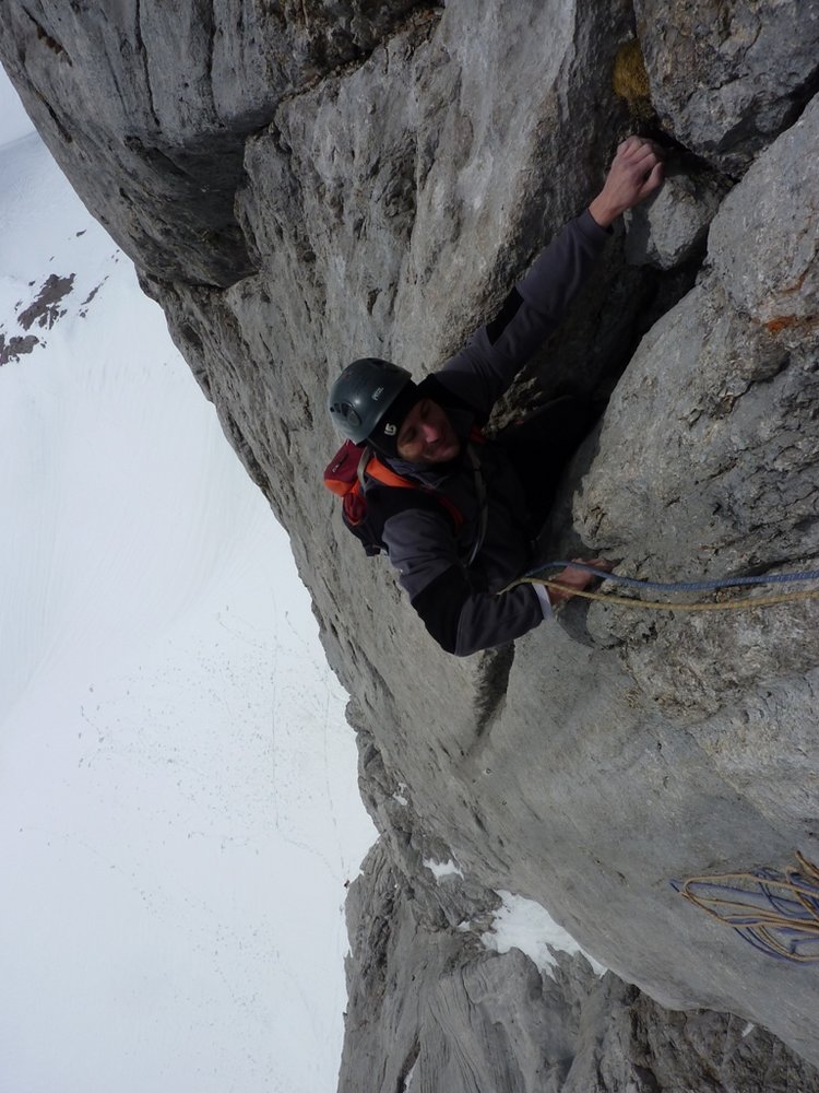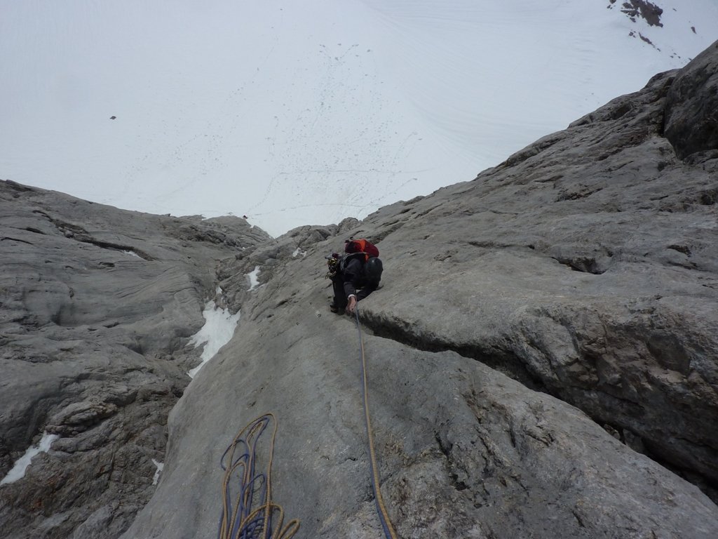 Die Bohrhaken stecken genau dort, wo man sie auch braucht. Lediglich an zwei Stellen (siehe Topo) sind ein B.D. 3er und 4er Friend beruhigend, da hier bewusst kein Bohrhaken gesetzt wurde. Sie lassen sich aber sehr leicht platzieren