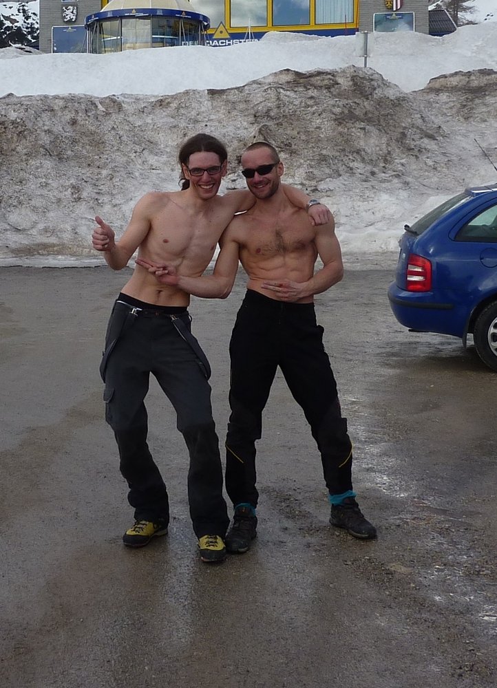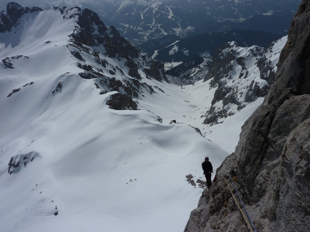 Entweder man seilt nach der letzten schweren Seillänge über die Tour ab, oder man geht weiter bis zum Ausstieg und quert dann links zur Abseilpiste. Dann entweder wie bekannt zurück zur Hunnerkogelbahn oder in ca. 1,5h über das Edelgrießkar zum Parkplatz absteigen.