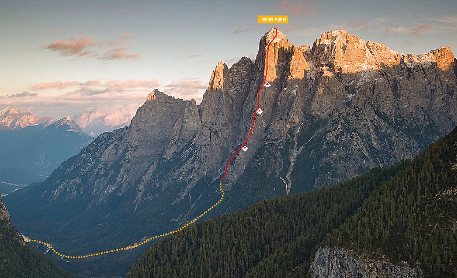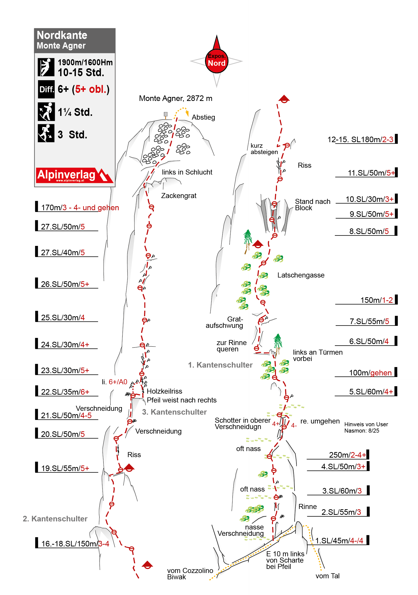 Die Nordkante am Monte Agner gehört zu den ganz großen und langen Touren in den Dolomiten bzw. den gesamten Ostalpen. Die Höchstschwierigkeiten sind hier zwar moderat, doch verlangt die Agnerkante nach einem konditionstarken Alpinisten, der ein Gespür für die Routenfindung hat und sich sicher in Latschen und seilfrei leichtem Schrofengelände bewegt.