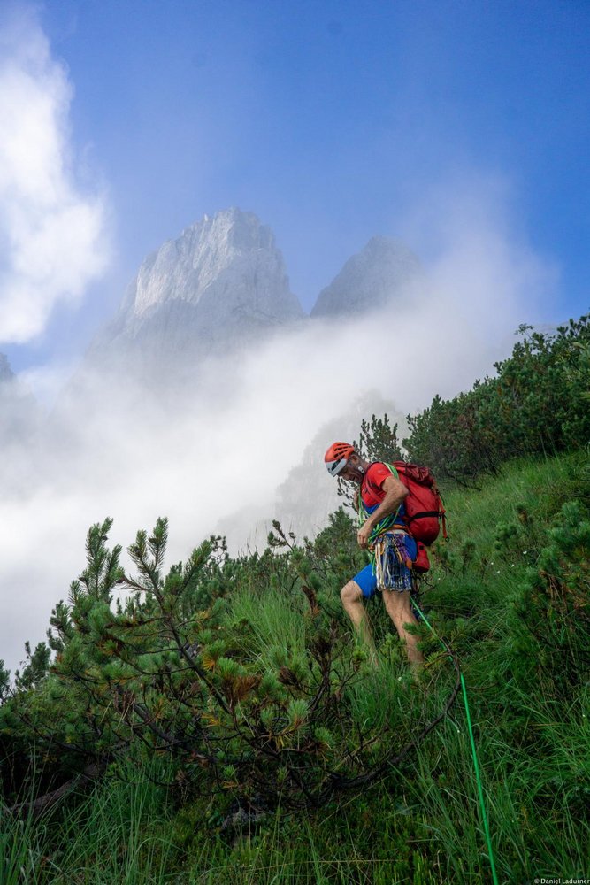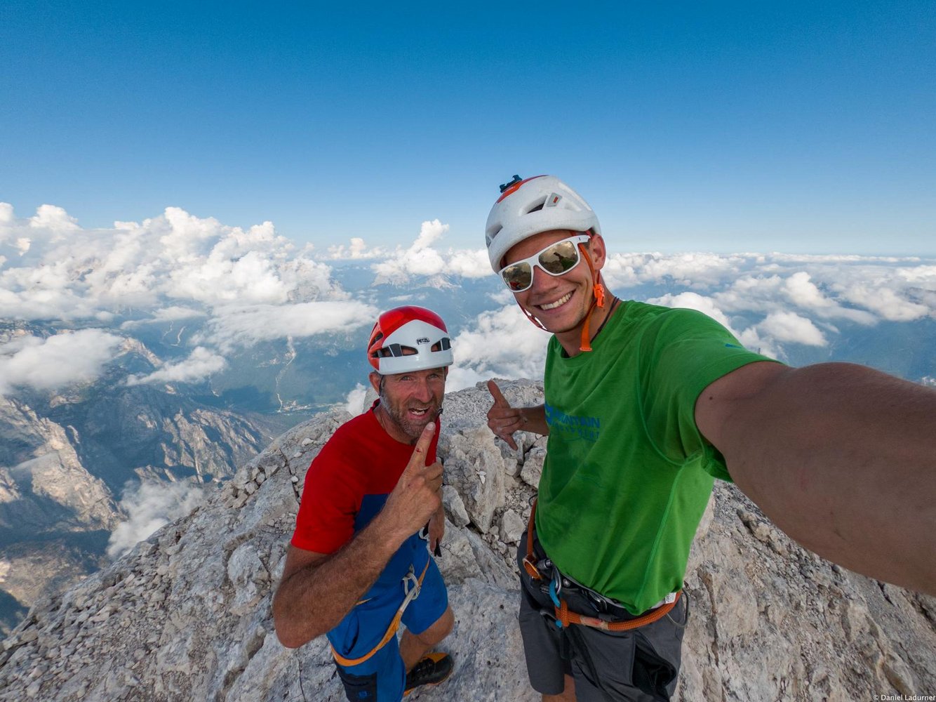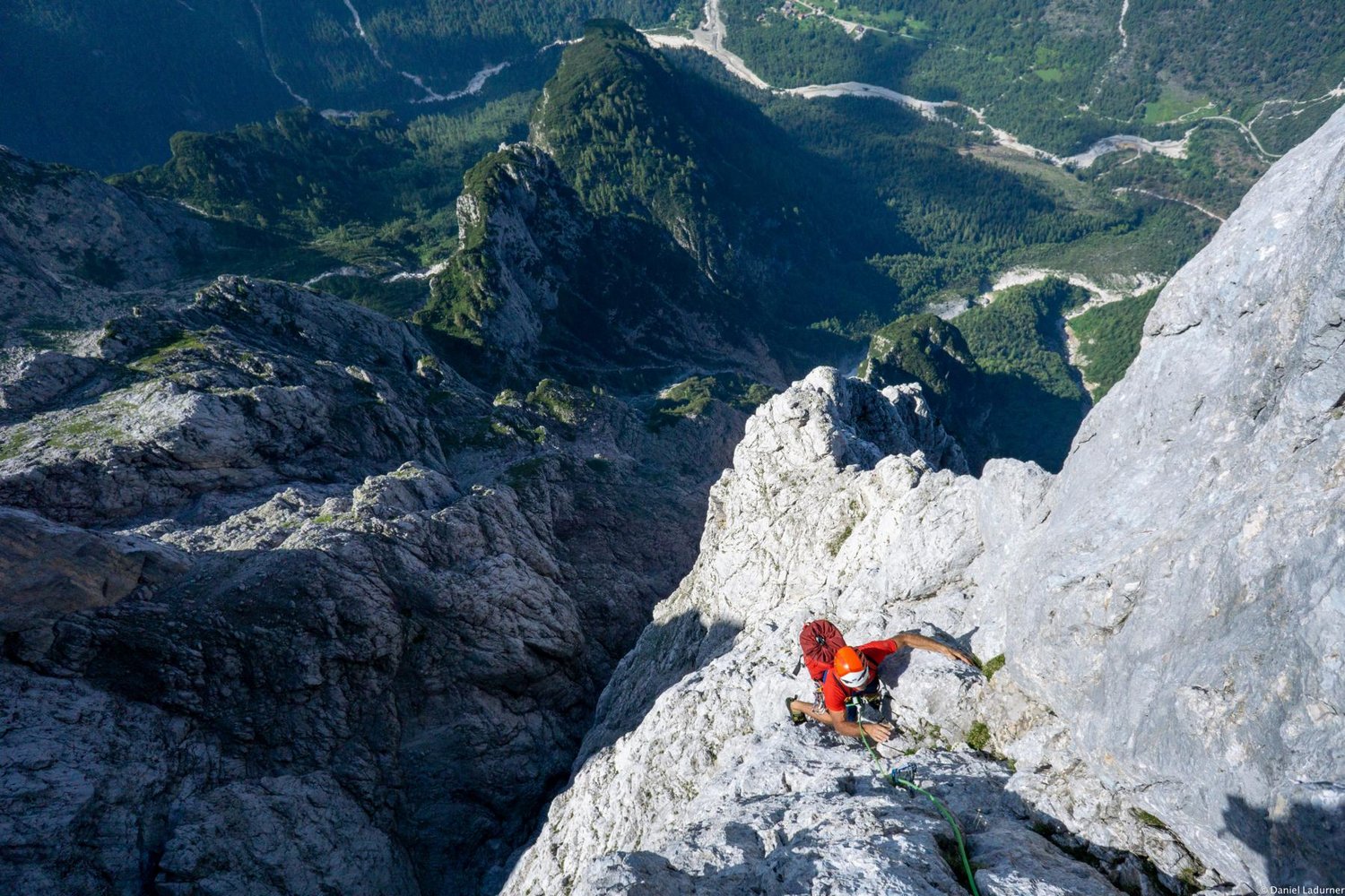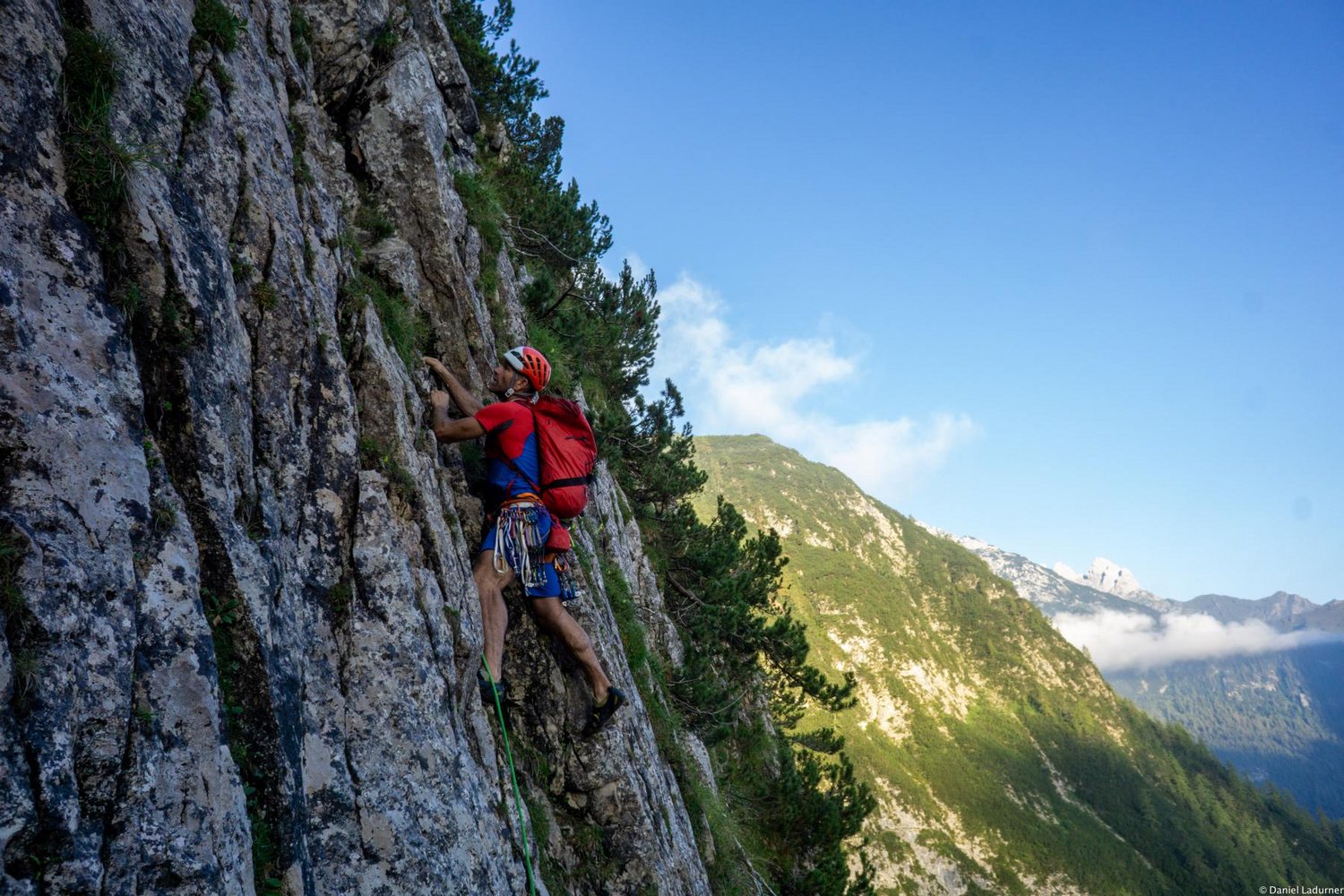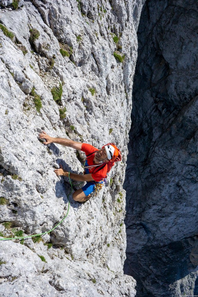 Nach einigen einfachen, auch nach mehreren trockenen Tagen oft nassen Seillängen mit Gras, Latschen und nicht immer solidem Fels gelangt man auf die erste Gratschulter. Nach dieser wird die Kletterei nach oben immer Schöner, solider und steiler. Die Routenfindung ist meist logisch, wobei man eben auf dieser ersten Gratschulter relativ weit nach rechts queren sollte und die Verschneidung mit dem Klemmblock hinaufsteigen. Nach einem schönen Grauen Riss und einer kurzen Verschneidung gelangt man zur Schlüsselstelle die entweder „original“ rechts über einen anstrengenden nicht ganz einfachen, und etwas abgespeckten Riss klettert, oder links über eine Platte. Nachher gibt’s noch einige super coole Seillängen durch Risse, Platten und Schuppen fast in Marmolada Stil bis zum Gipfelgrat. Dieser führt dann sehr einfach aufs Band unter dem Hauptgipfel. Von dort noch etwa 15min über einen Klettersteig auf den Gipfel.