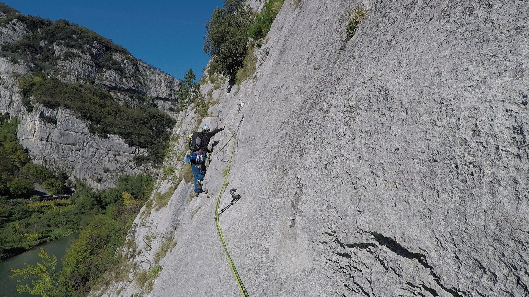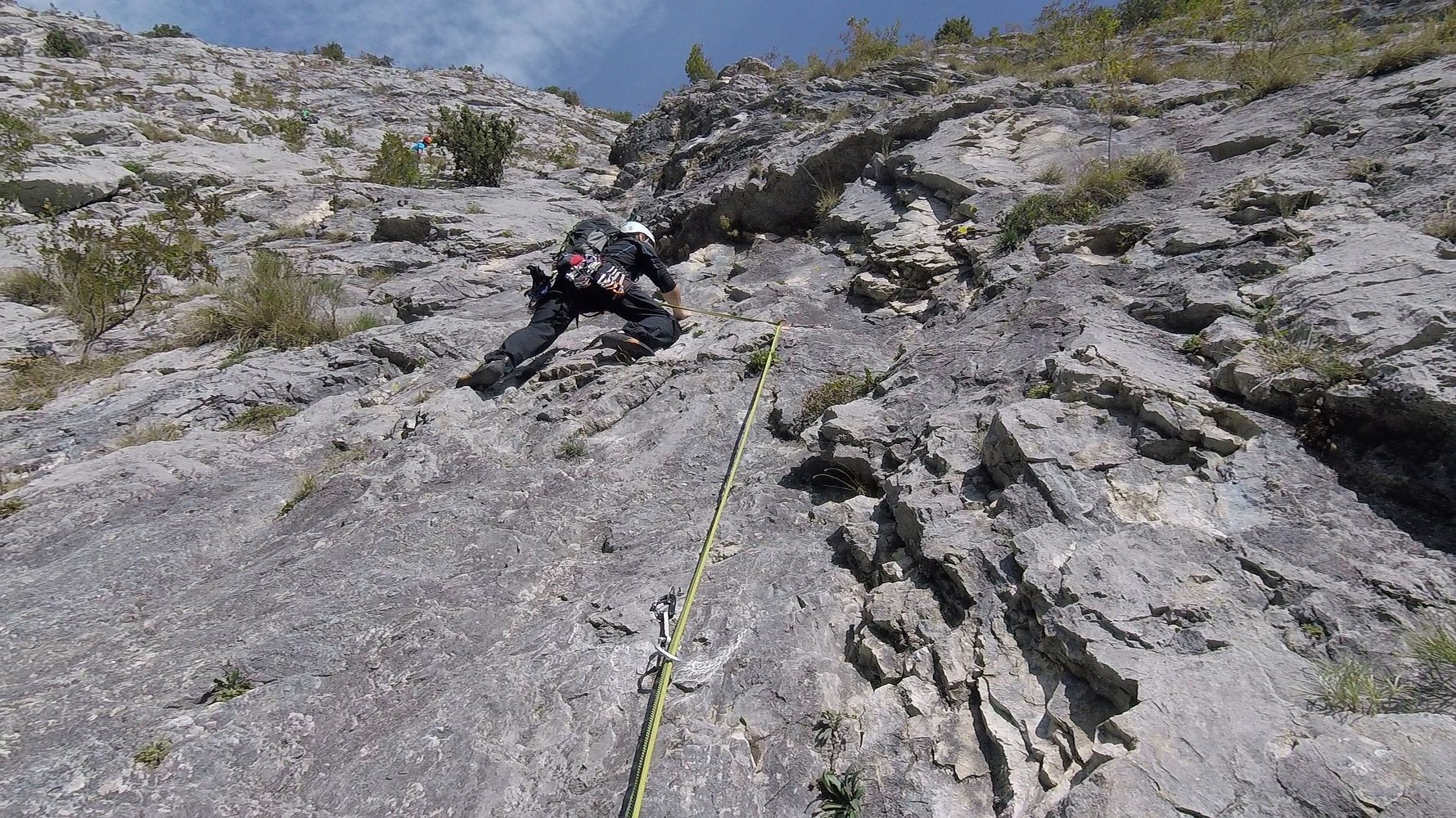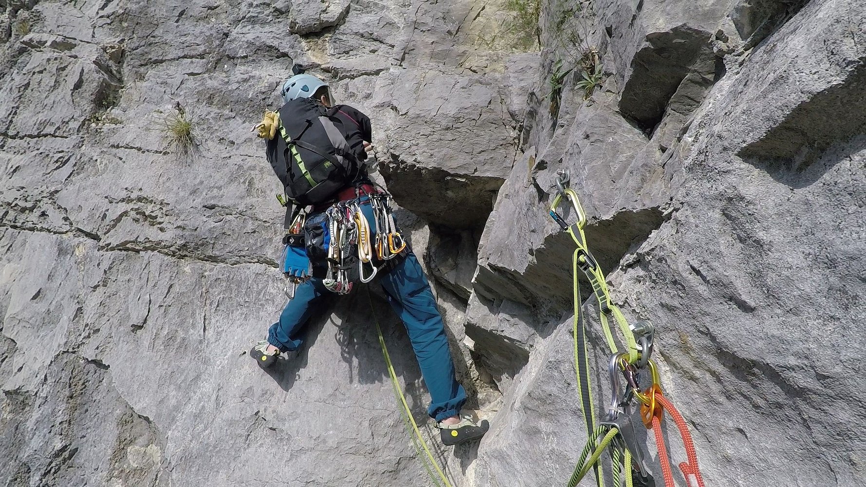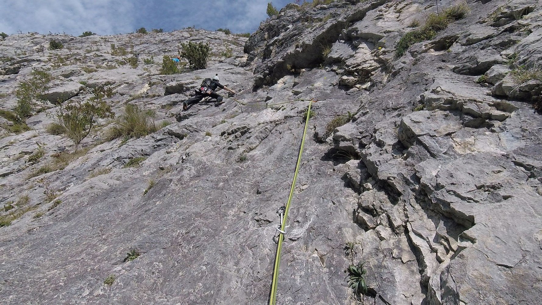 1 x 50 m Einfachseil, 10 Expressschlingen und unbedingt Helm.