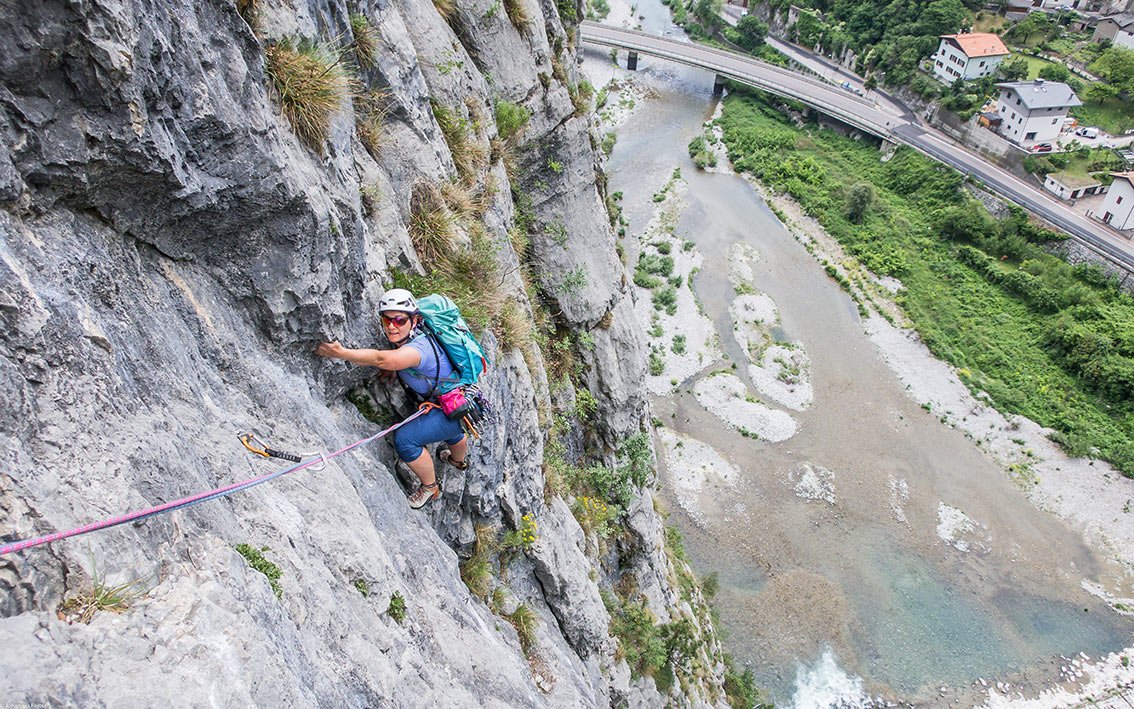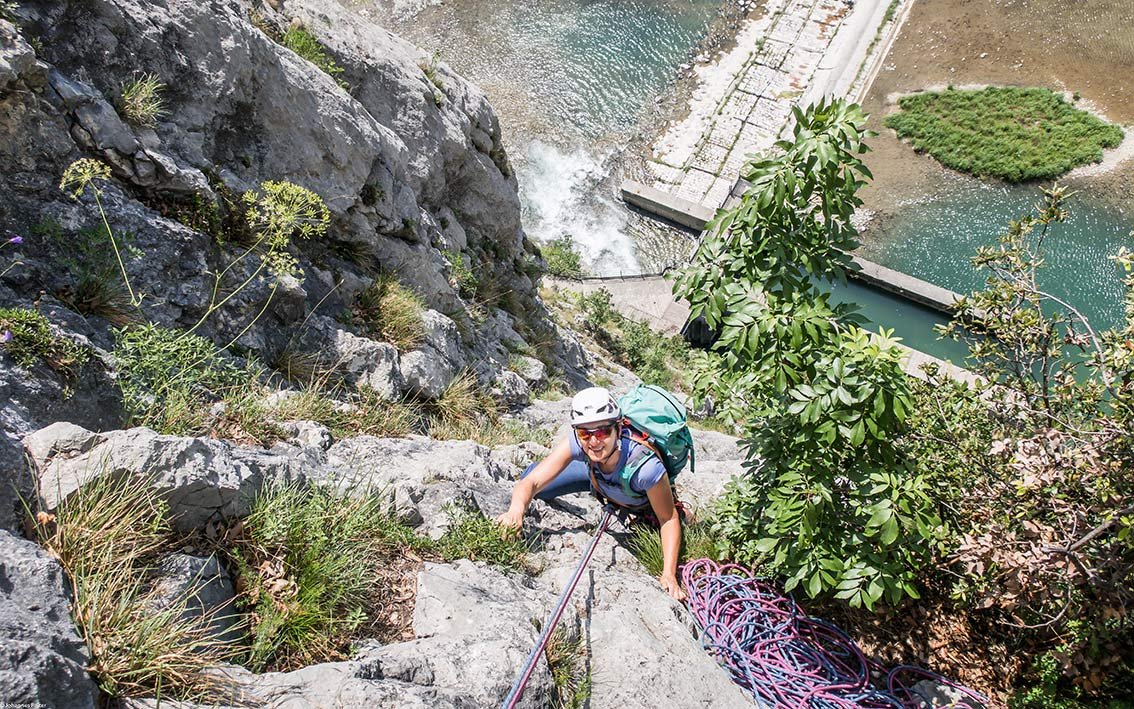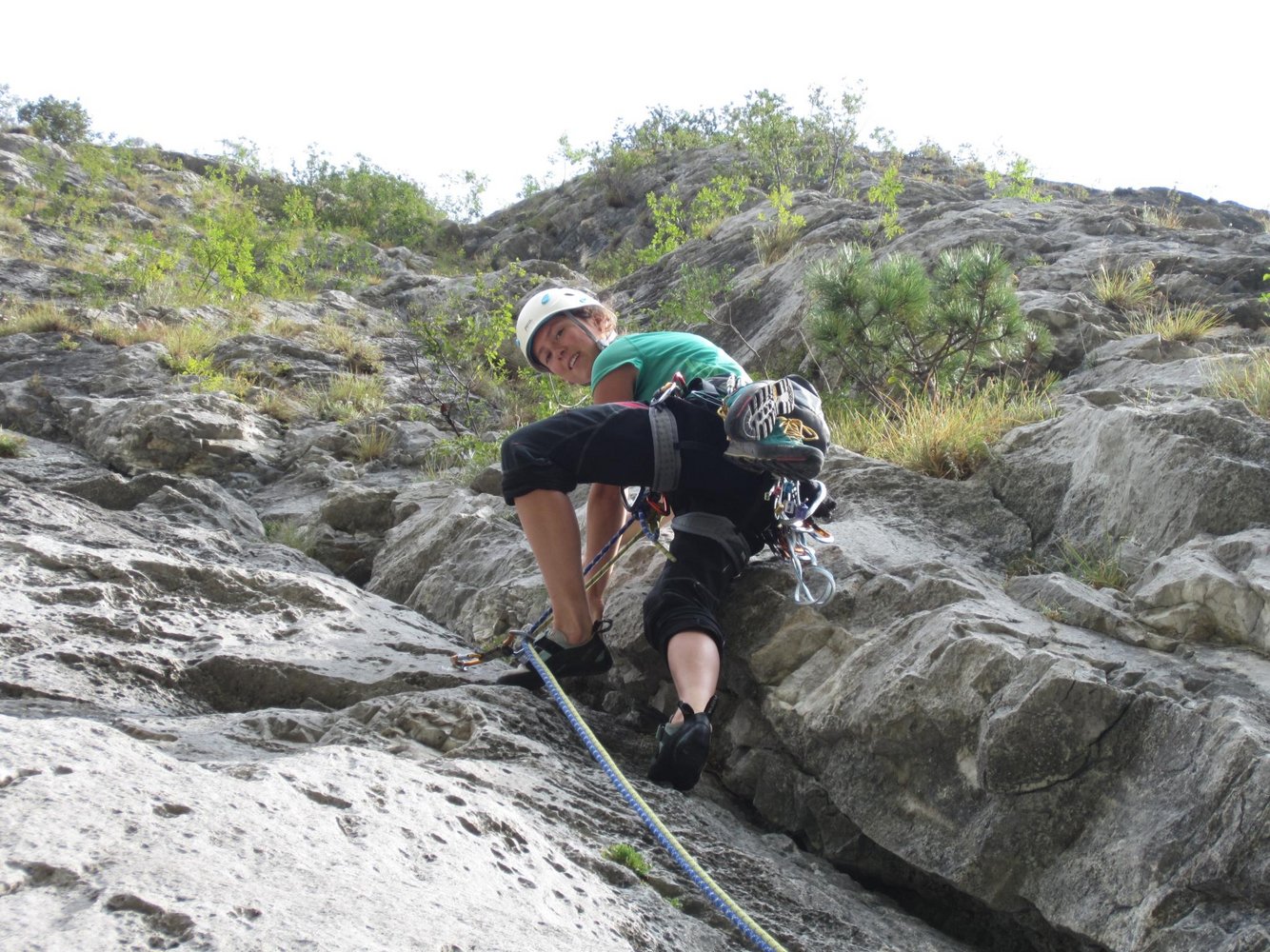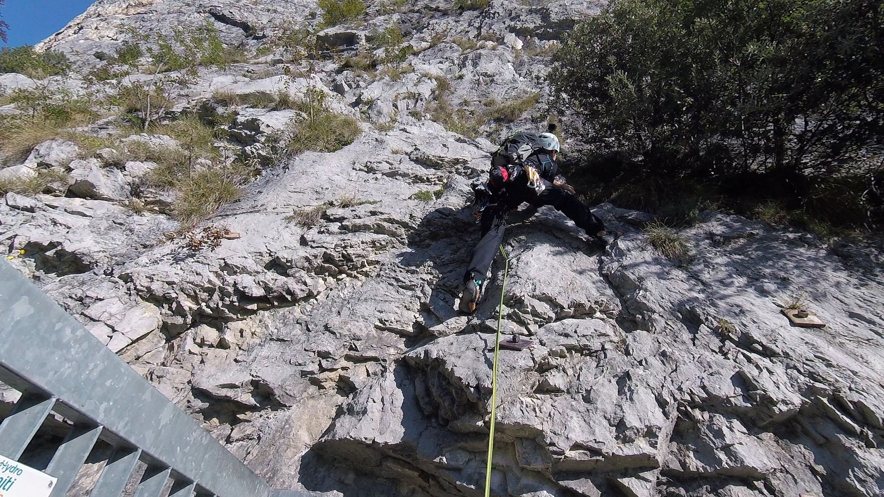 1 x 50 m Einfachseil, 10 Expressschlingen und unbedingt Helm.