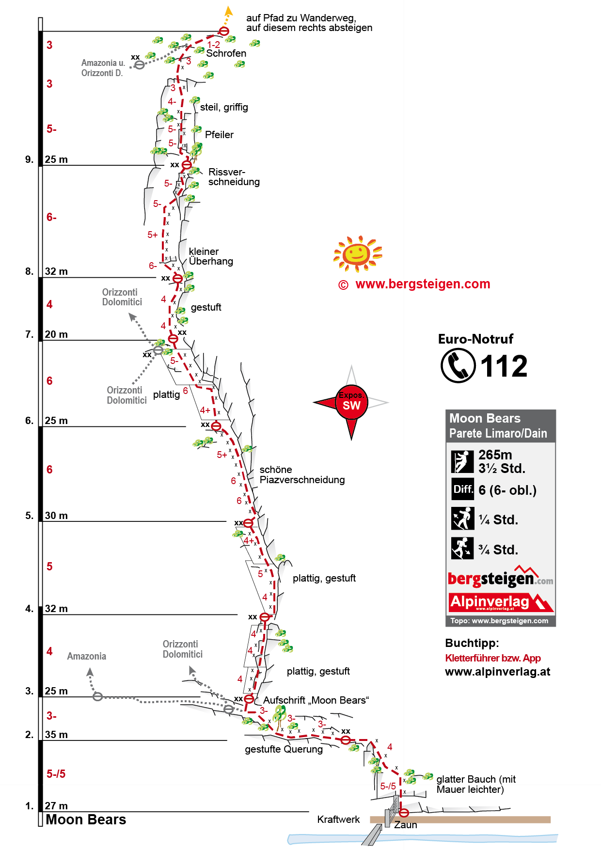 Die Route Moon Bears ist ein Klassiker an der Paret Limaro. Der Anstieg führt durch die untere Südwestwand des Piccolo Dains. Der Anstieg ist als Plaisirtour komplett mit Bohrhaken ausgestattet, trotzdem muss man zwischen den Haken etwas klettern. Aufgrund des kurzen Zustieges, der guten Absicherung und moderaten Schwierigkeiten eignet sich die Tour perfekt als Eingehroute für den Kletterurlaub. Problem könnte aber evtl. der Stau am Einstieg sein - es beginnen drei Routen mit den identischen 2 Einstiegsseillängen direkt beim Zaun des Kraftwerkes.