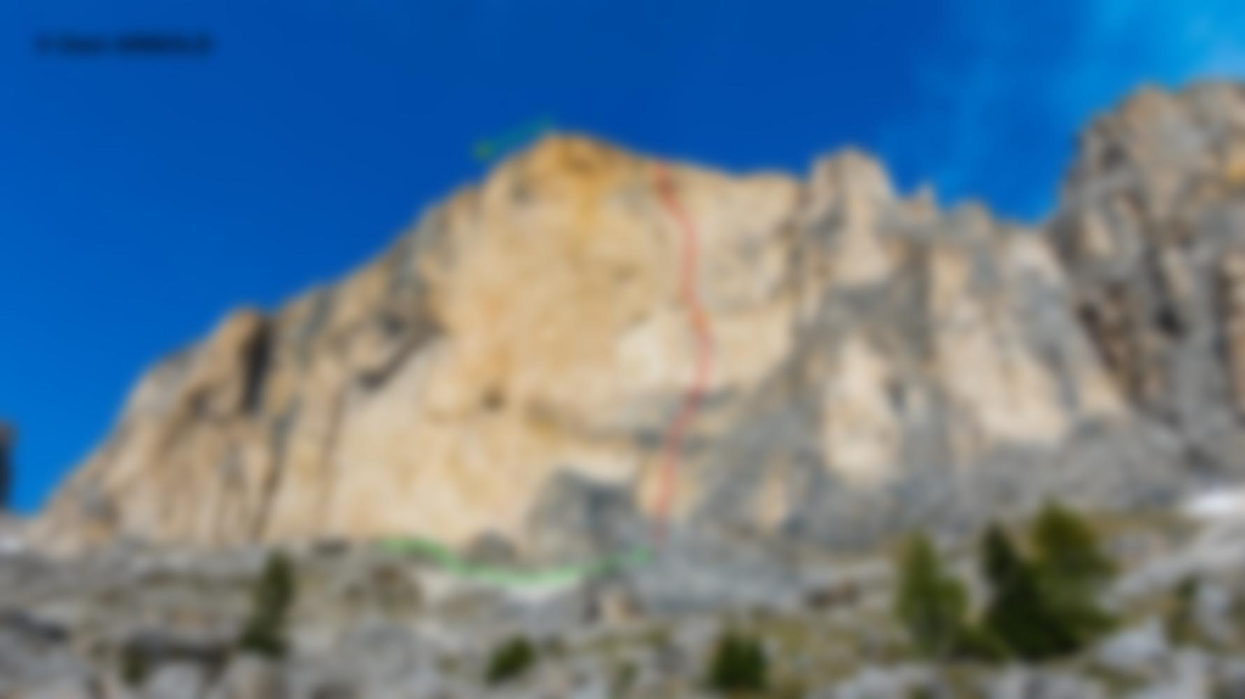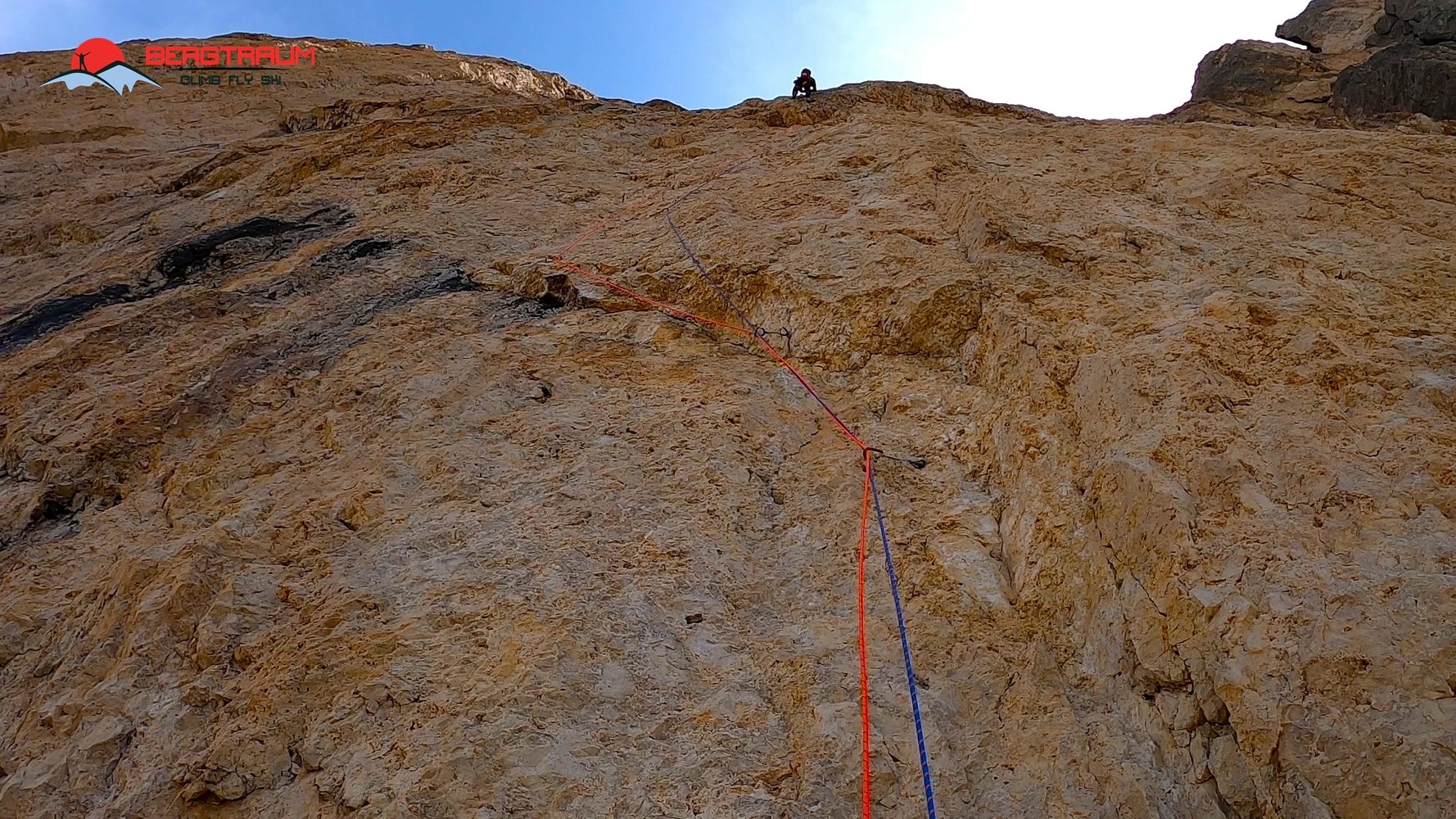 Siehe Topo. Immer der Nase und den Normalhaken nach. Die ersten beiden Seillängen sind noch brüchig und zeigen dir gleich, dass man in den Dolomiten angekommen ist. Der Fels wird dann zwar ab der fünften Länge um einiges besser (die Erstbegeher haben hier wohl Tonnen von Fels in den Abgrund befördert), ist aber nirgendwo bombig. Die Schlüssellänge (5. SL, 9-) ist ein Ausdauerhammer bis zum Stand hinauf. Auslockern kann man nur unmittelbar unter der Schlüsselstelle unter dem kleinen Dach. Rotpunktaspiranten sind hier voll gefordert.