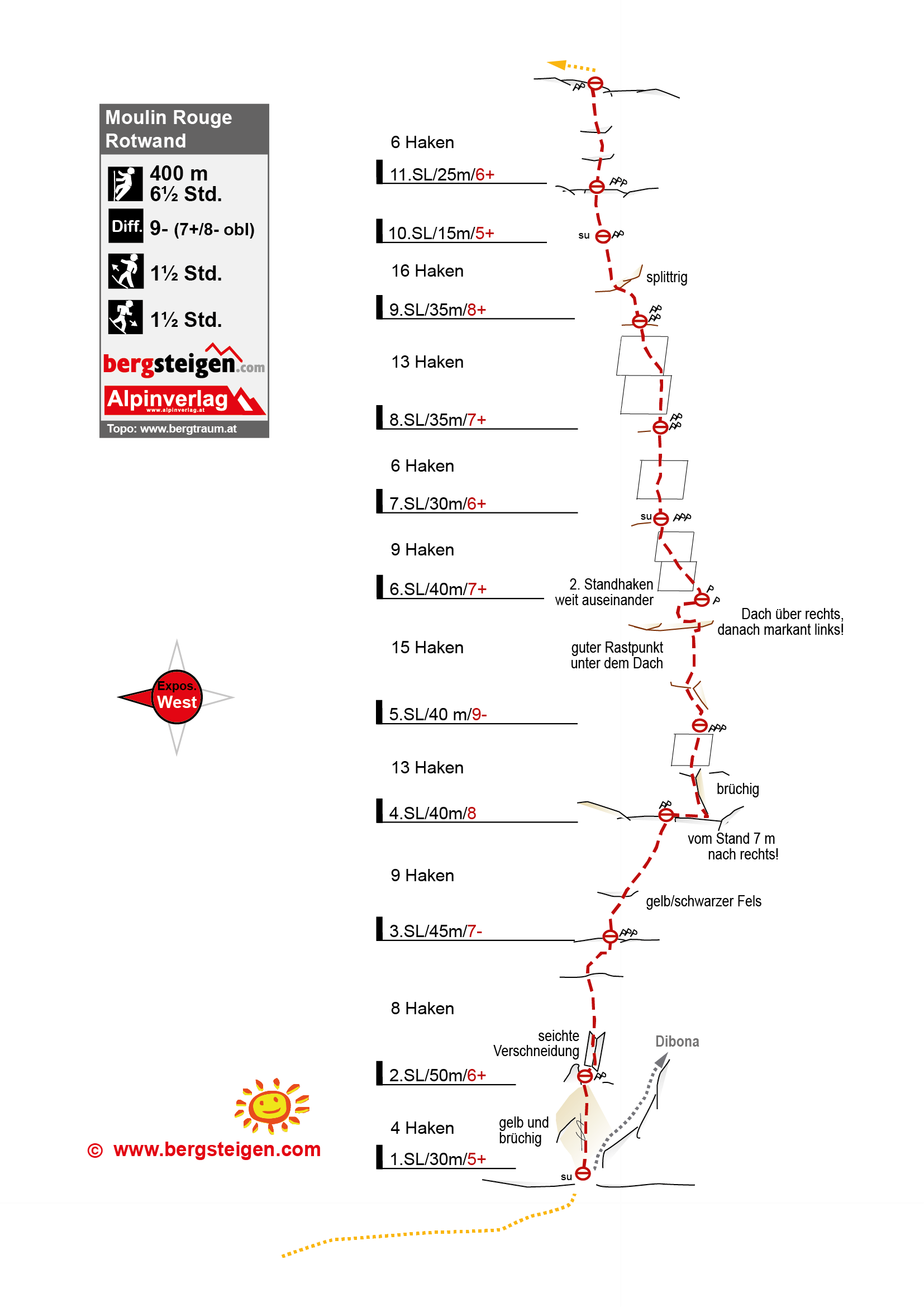 senkrechte bis überhängende Wandkletterei in teils splittrigem Fels. Die Felsqualität wird nach oben hin um einiges besser.