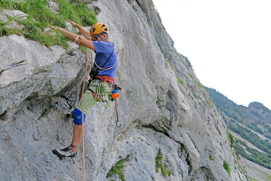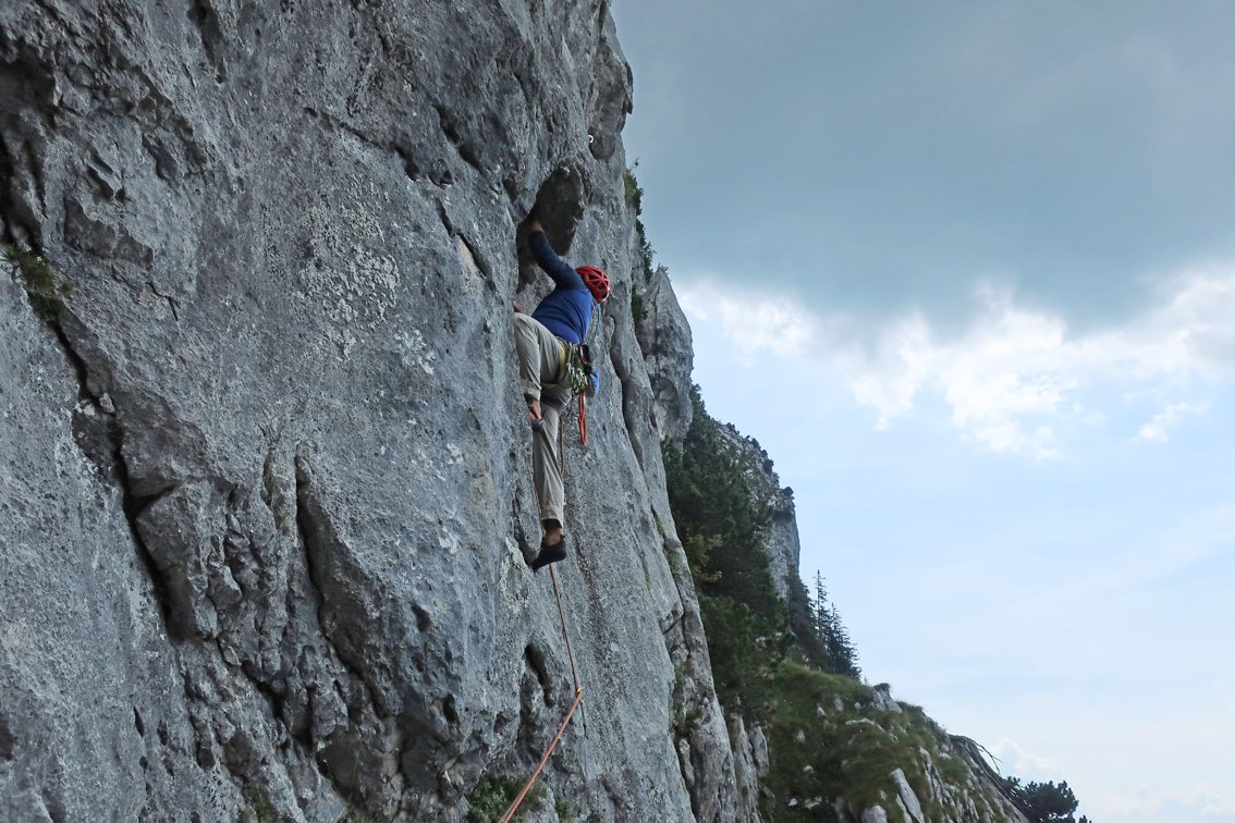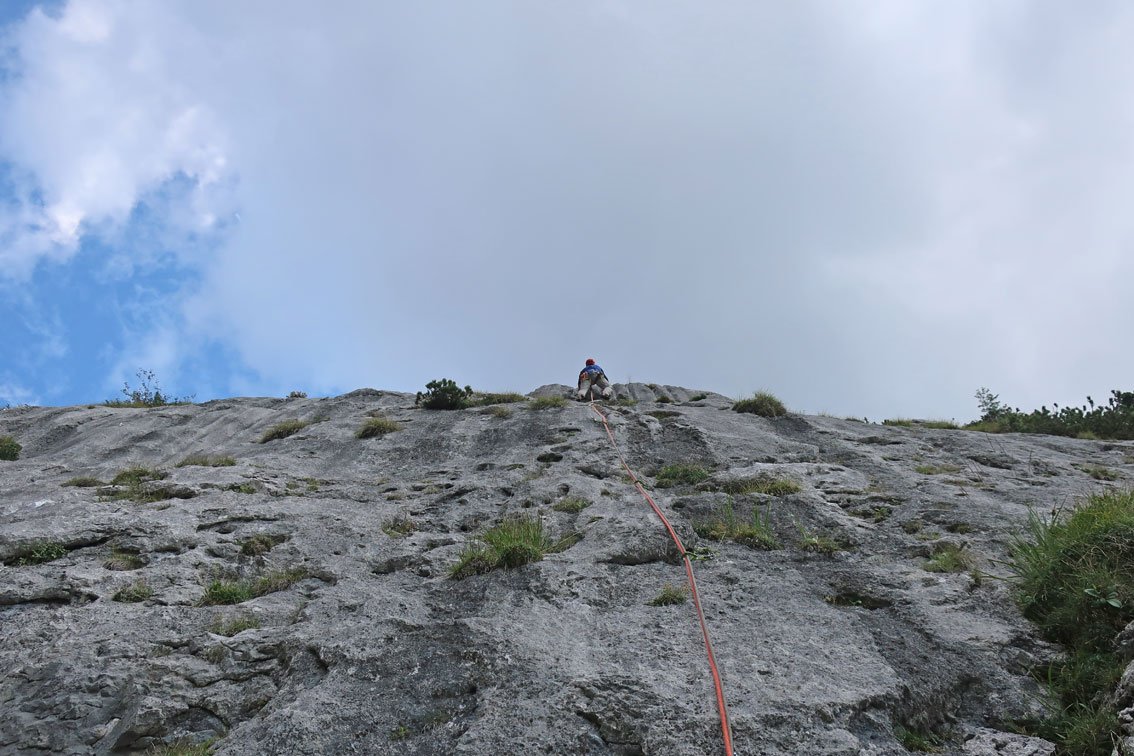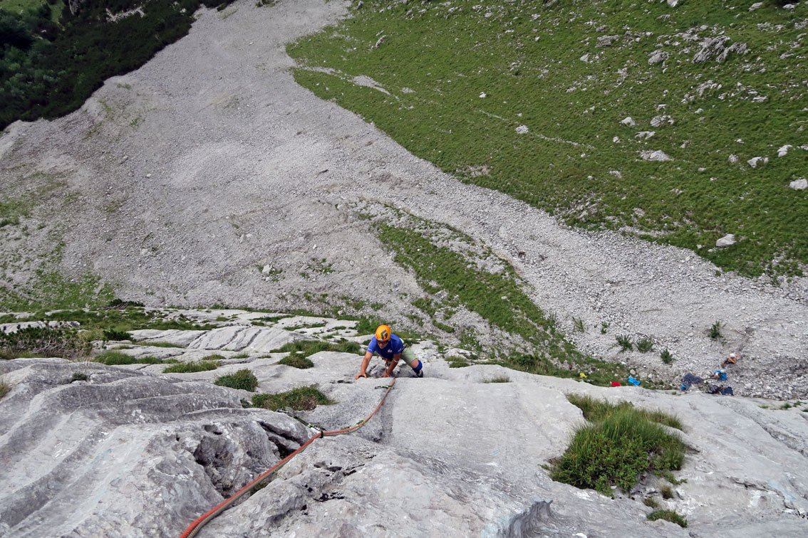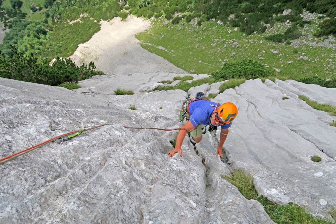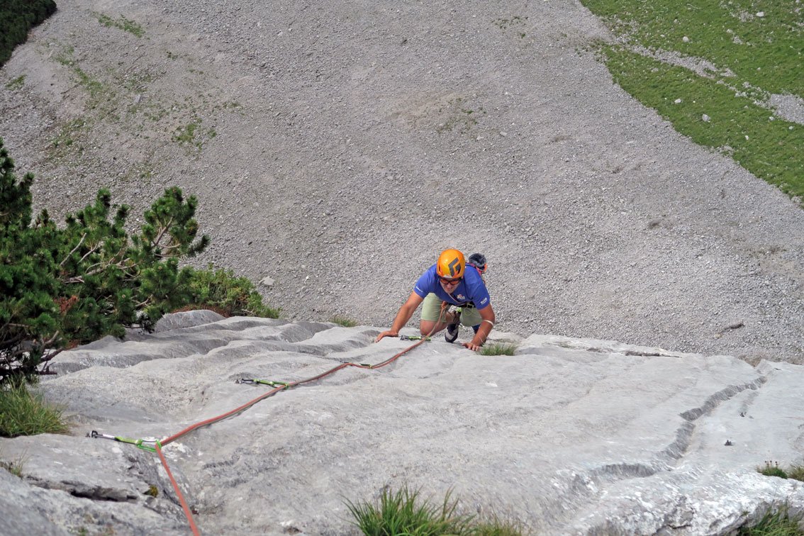 Schöne, recht selten gemachte Routenkombination im linken Teil der Multerkarwand. Die Route wird nach oben hin immer besser uns hat ein perfektes Finale (steiler Piazriss gefolgt von einer glatten Rillenplatte). Die Tour eingnet sich auch gut als Zweittour oder Ausweichroute (falls andere Routen besetzt sind).