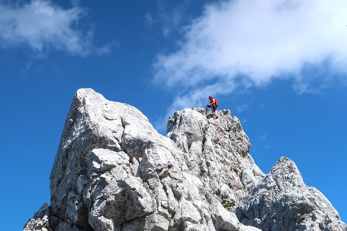 1 x 60 m Einfachseil (damit tut man sich bei der Abseilstelle am leichtesten), 3 Expressschlingen und Helm. Die Überschreitung wird auch oft ohne Seil begangen.