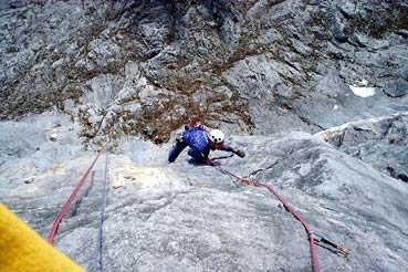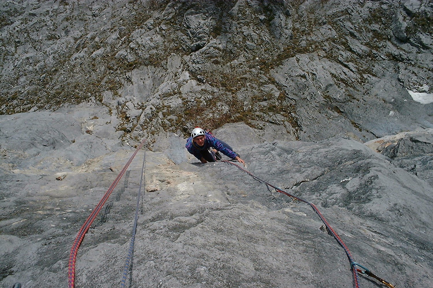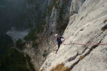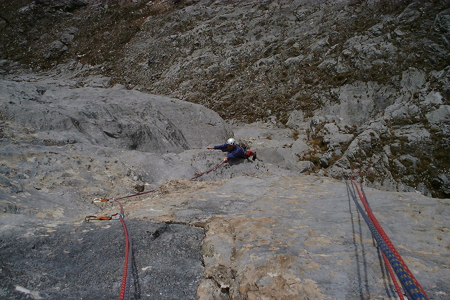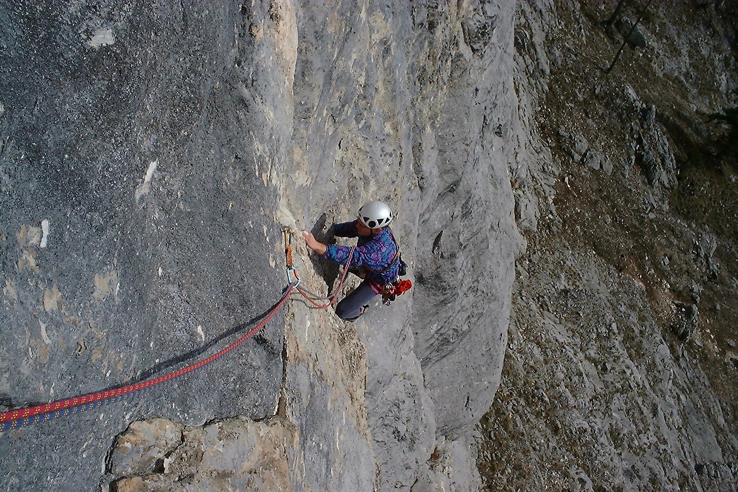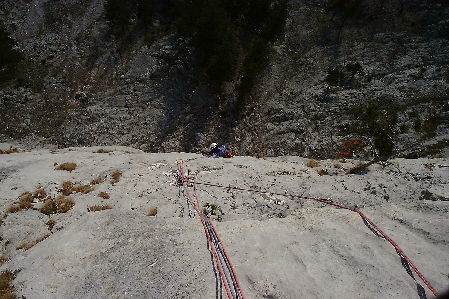 Die Route ist sportklettermäßig abgesichert (an den schweren Stellen) in den leichten längen auch etwas weiter.