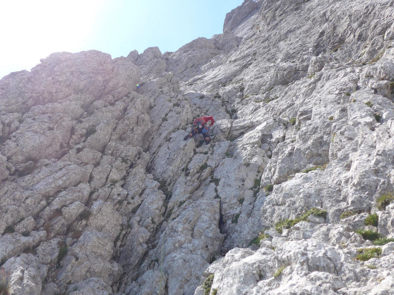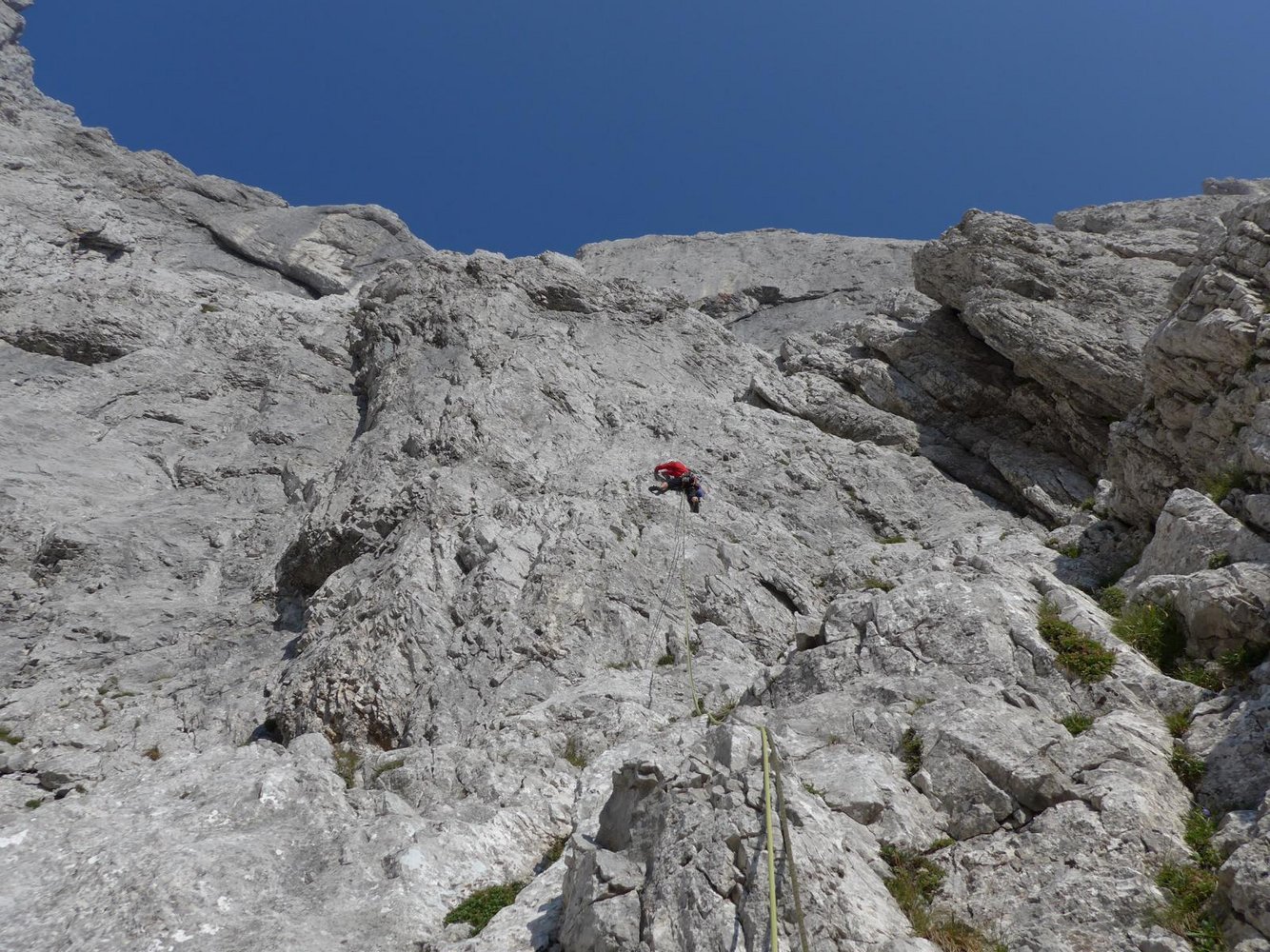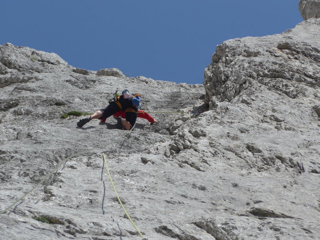 Laurenz Trawnicek und Anna Fürnsinn im August 2015, von unten und ohne vorheriges Erkunden. Erste Rotpunkt-Begehung durch Laurenz Trawnicek am 14.8.2015 im Zuge der Erstbegehung der letzten 3 Seillängen.