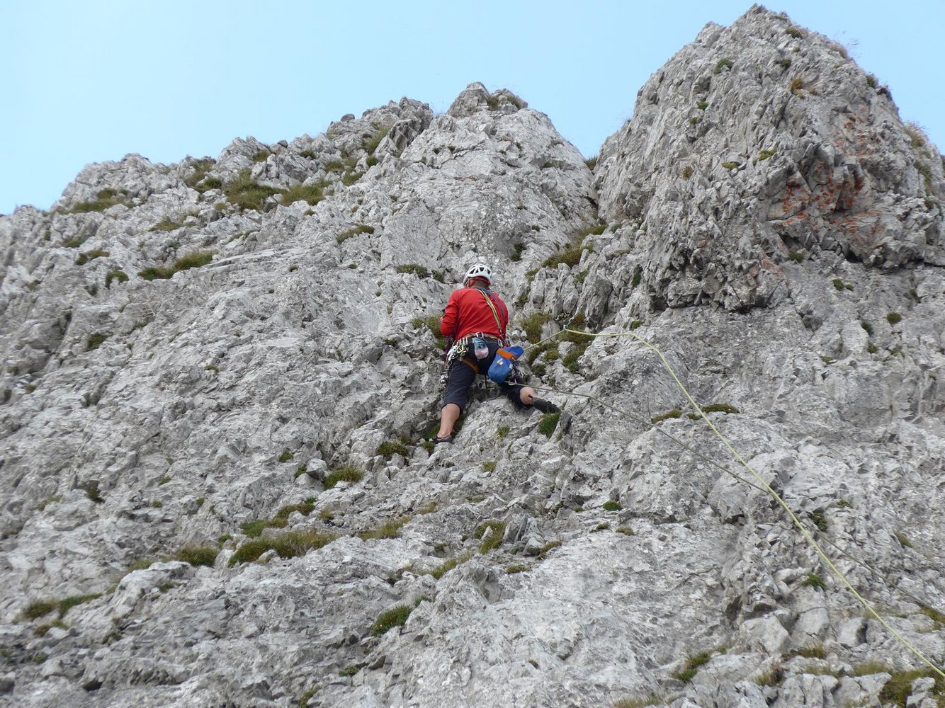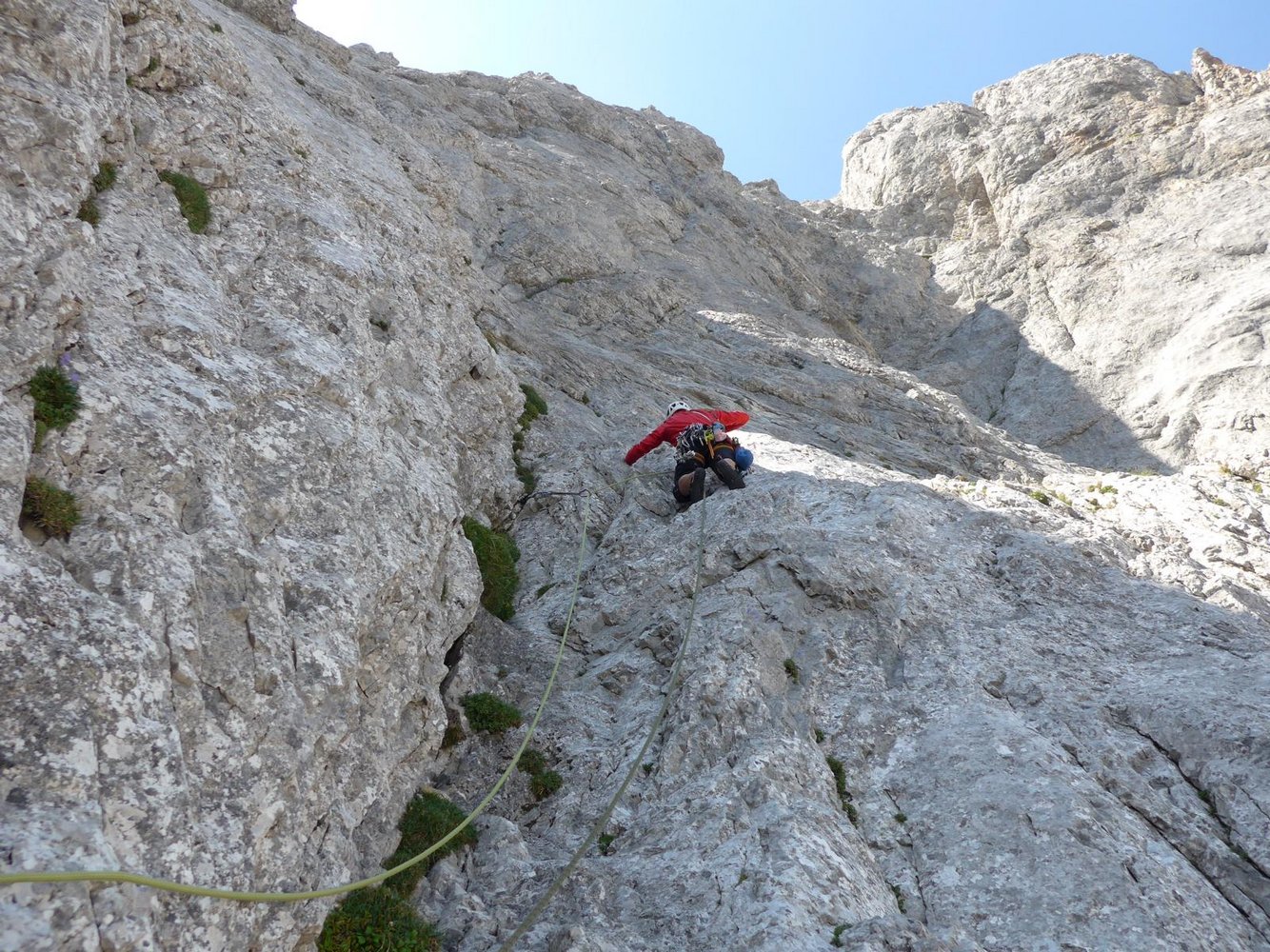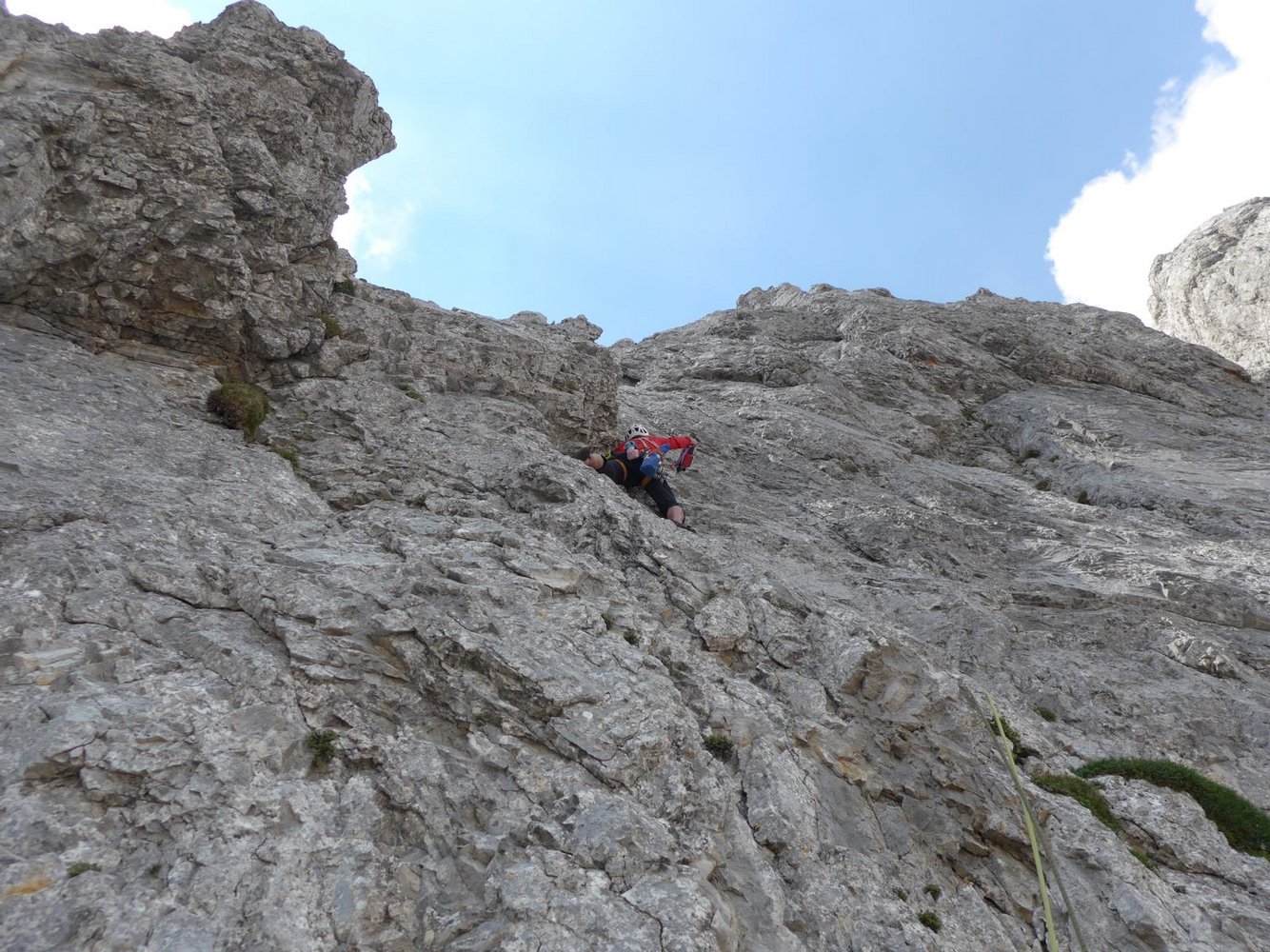 Laurenz Trawnicek und Anna Fürnsinn im August 2015, von unten und ohne vorheriges Erkunden. Erste Rotpunkt-Begehung durch Laurenz Trawnicek am 14.8.2015 im Zuge der Erstbegehung der letzten 3 Seillängen.