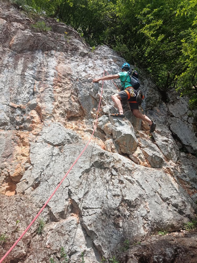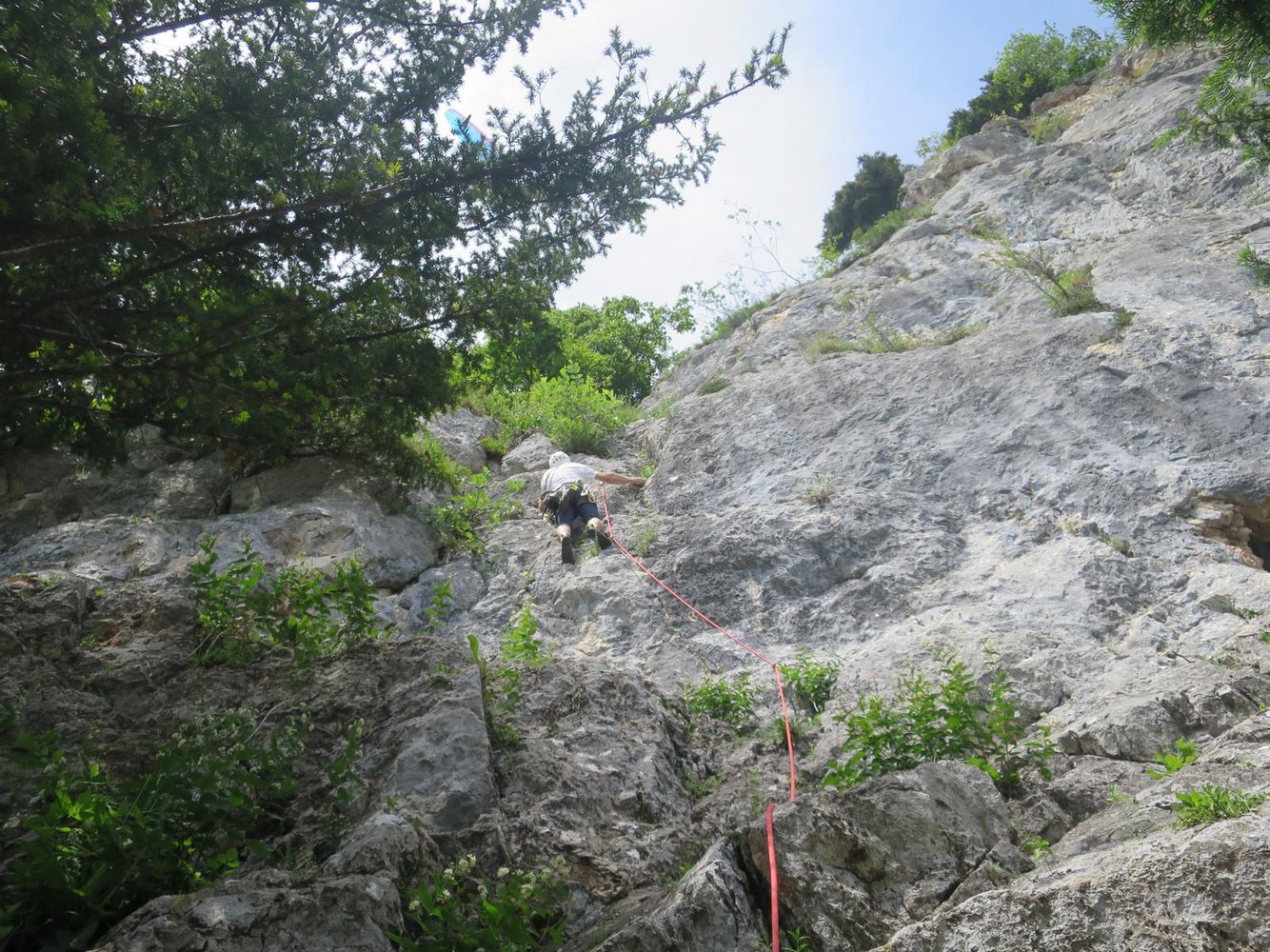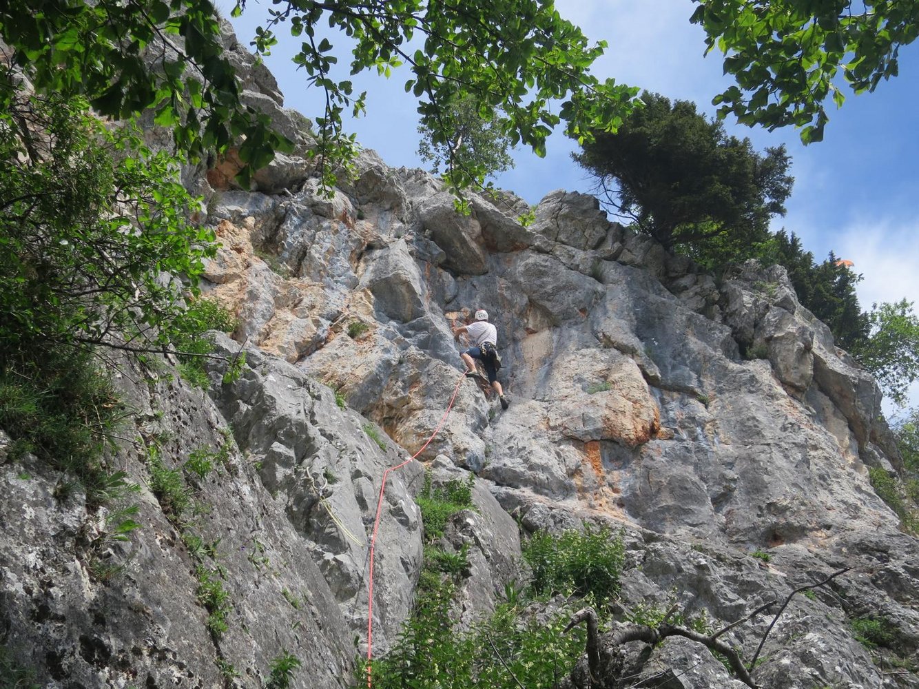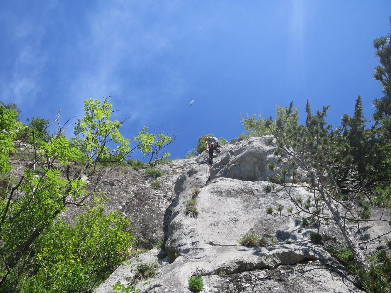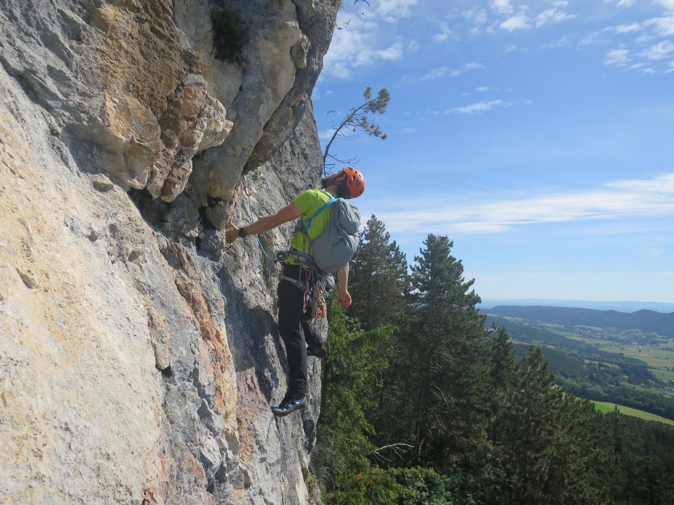 Revitalisierte Uralt-Kletterroute, die durchaus nette Seillängen (1-3, 6 und 8) aufzuweisen hat. Im Mittelteil aber viel Schrofengelände und nach dem Einstieg und in der 7ten Seillänge auch erdig.