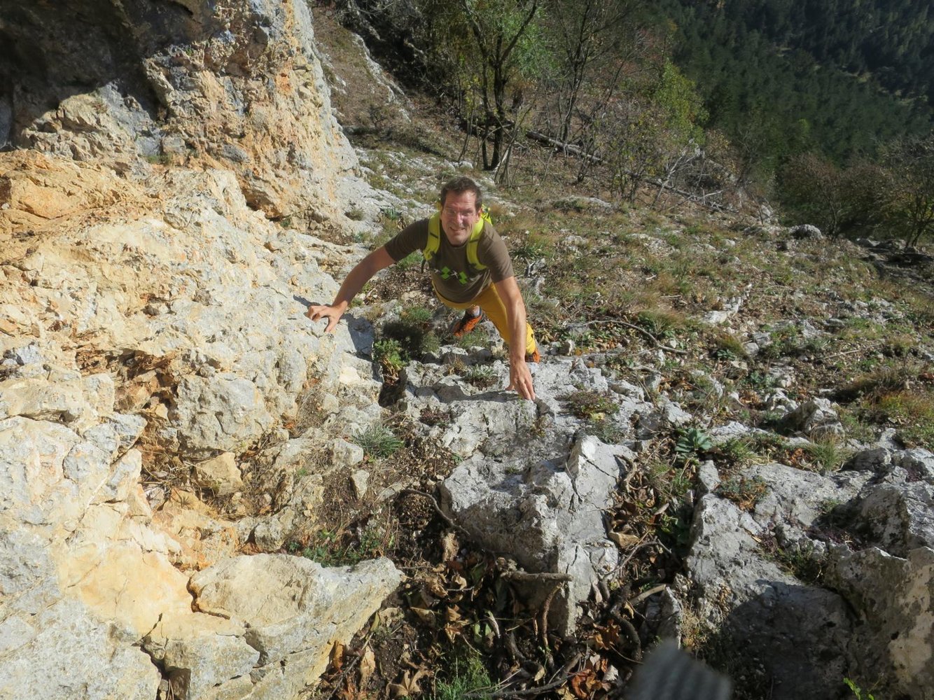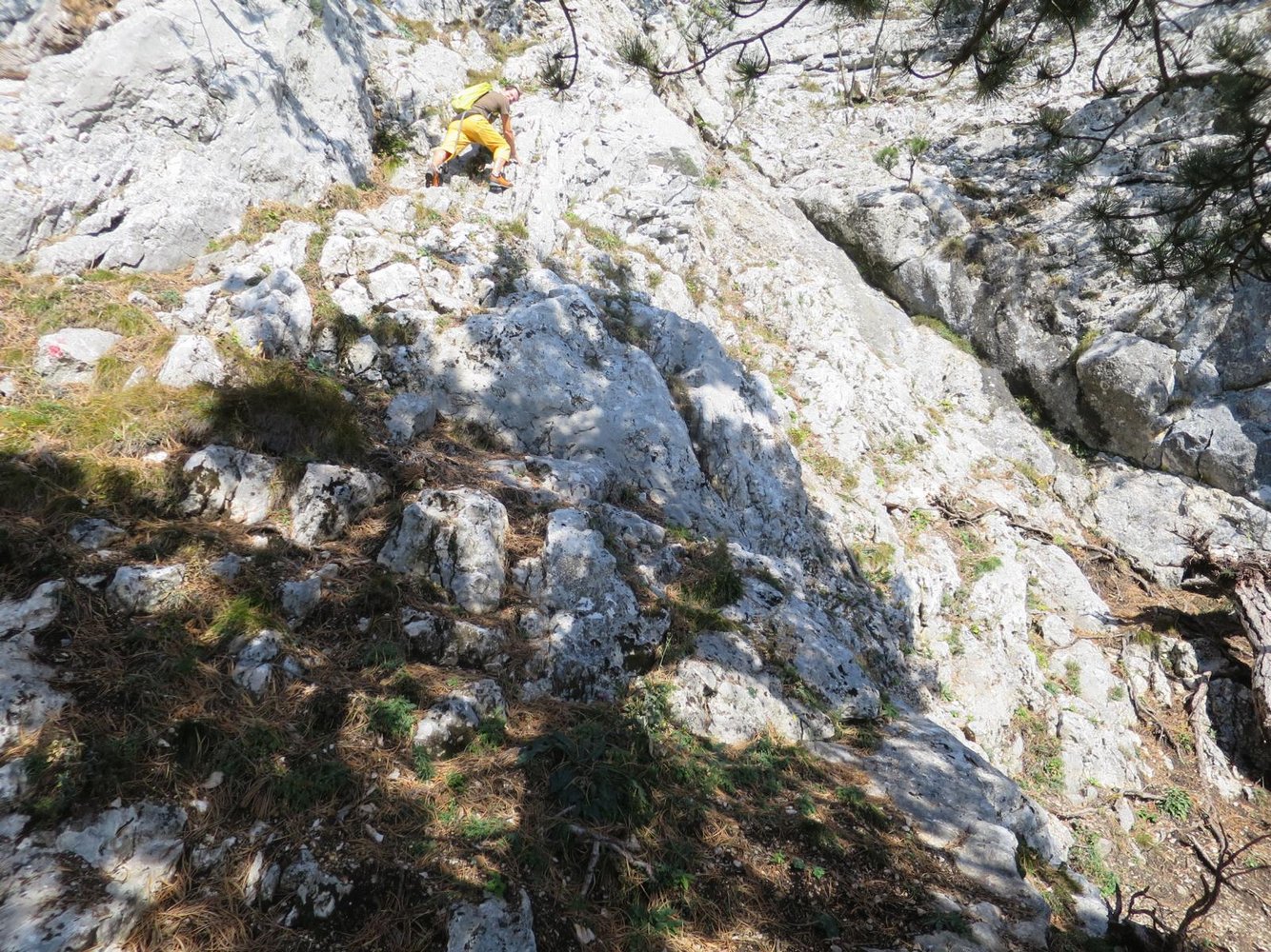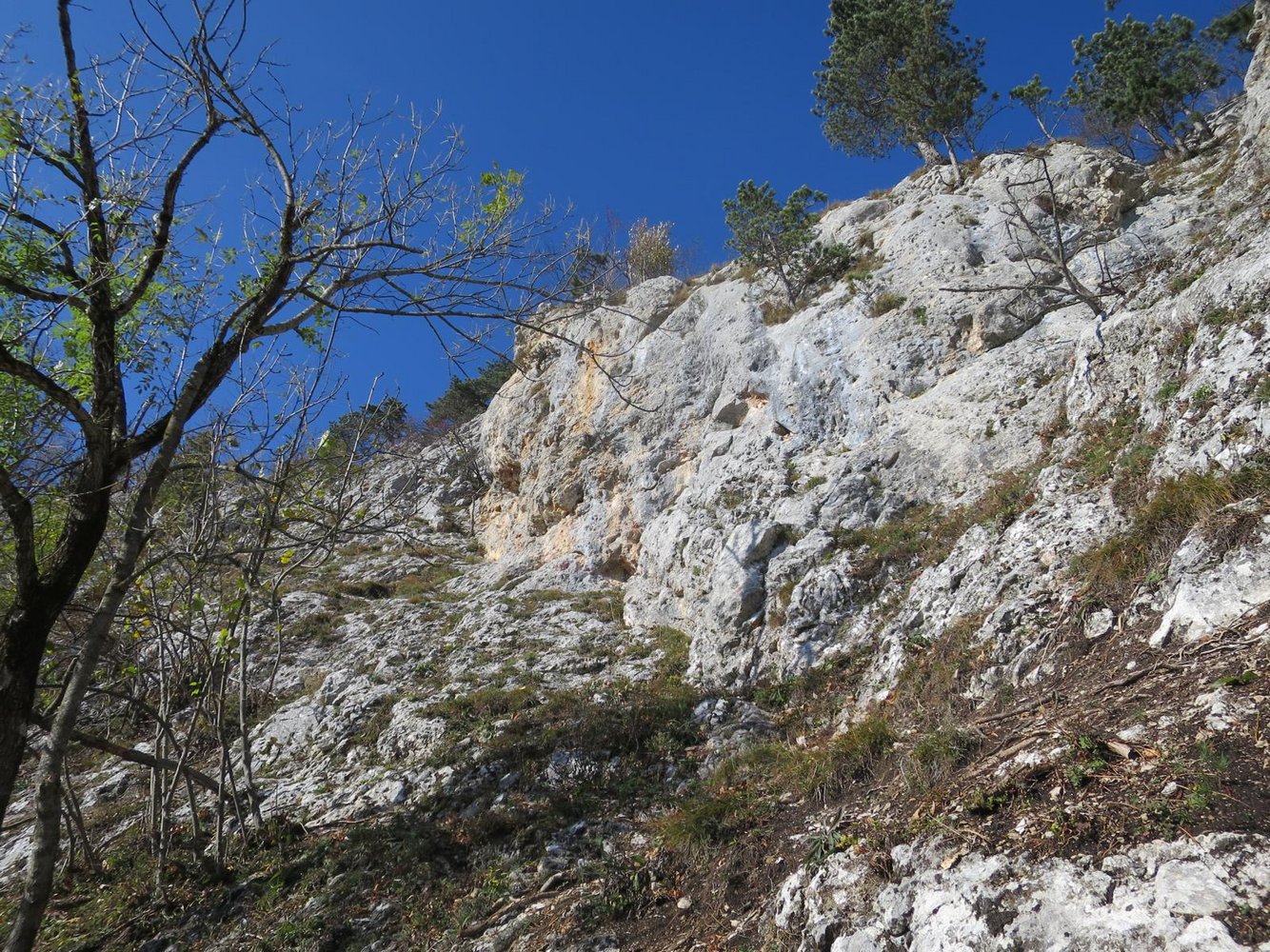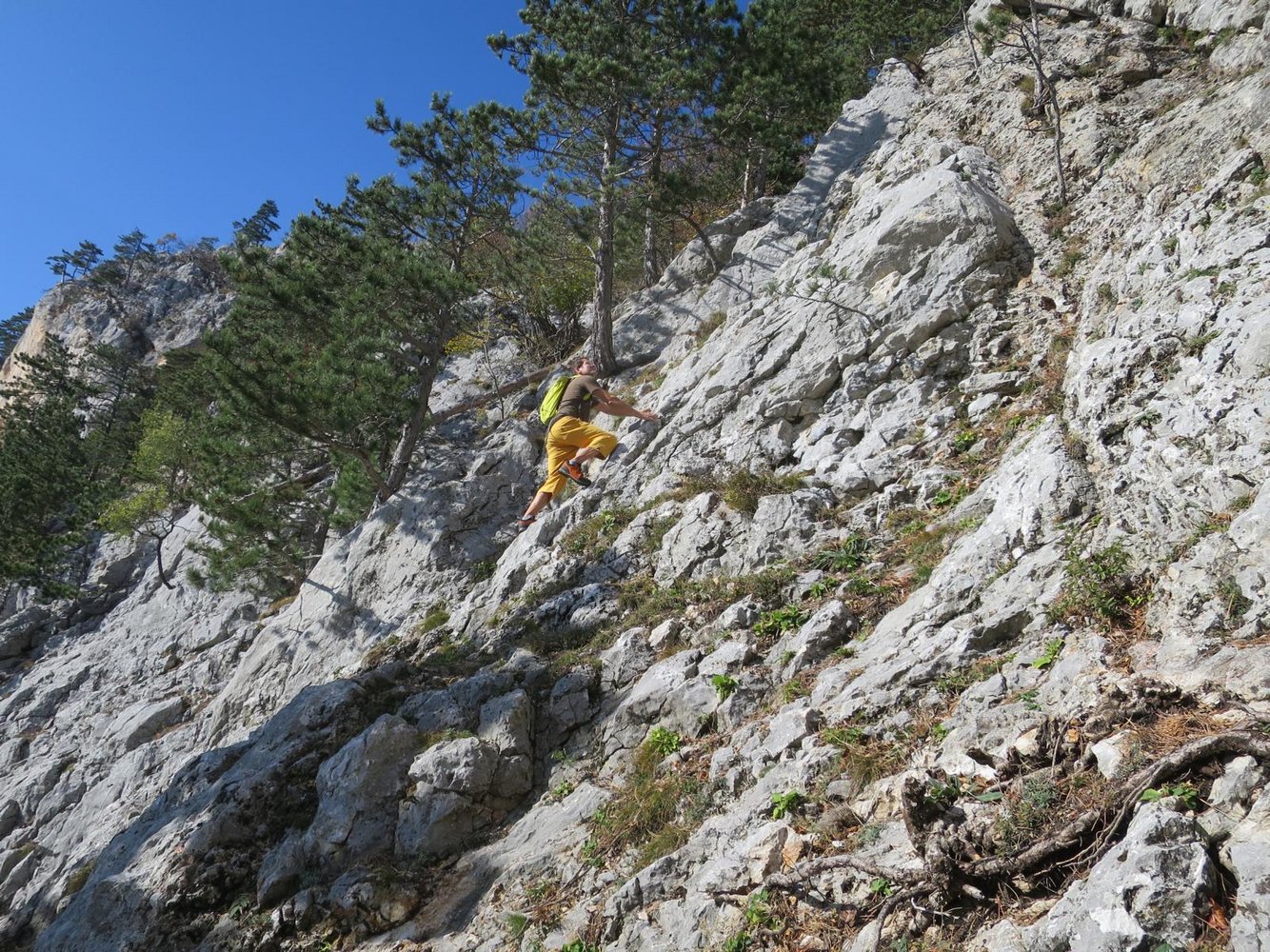 Ein alter, einsamer Anstieg, der revitalisiert wurde. Er wurde mit roten Punkten versehen und an der schwierigsten Stellte mit einem Drahtseil ausgestattet. Für Liebhaber alpiner Anstiege, bei denen das reine Klettern nicht im Vordergrund steht, ein Erlebnis. Viel Gehgelände und einige ungute Schrofen, die absolute Trittsicherheit erfordern.