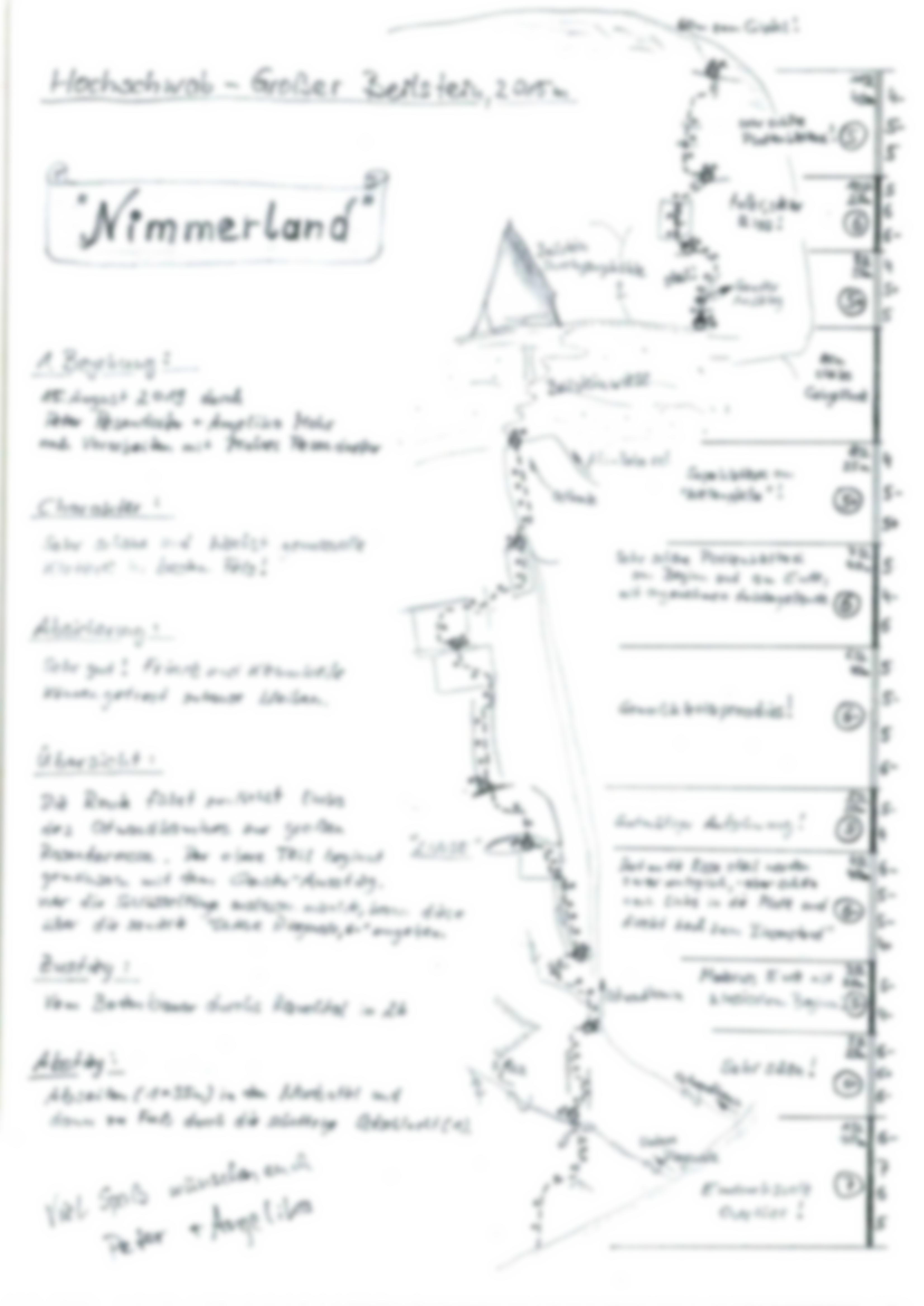 Durch ein Geröllkar nach der Waldgrenze hinauf. Der Weg verliert sich kurz auf einer Wiese unter der Stangenwand, man geht in der ursprünglichen Richtung leicht linkshaltend weiter, nach ca. 10 min "taucht" der Weg im Geröll wieder auf. Die Ostkante ist dann gut sichtbar, man steigt erst auf fast gleicher Höhe links zum Einstieg hinüber (mühsam im Geröll, aber bei genauerem Hinsehen sind Wegspuren zu erkennen). Siehe Übersichtsbild!