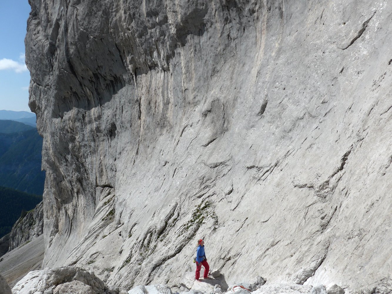 Die Route führt links des Ostwandkamins zur großen Rasenterrasse. Der obere Teil beginnt gemeinsam mit dem Gauster-Ausstieg.