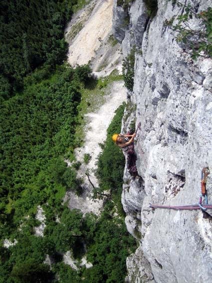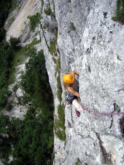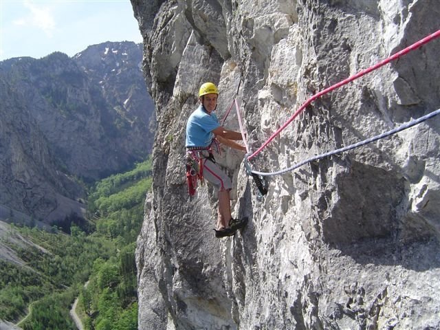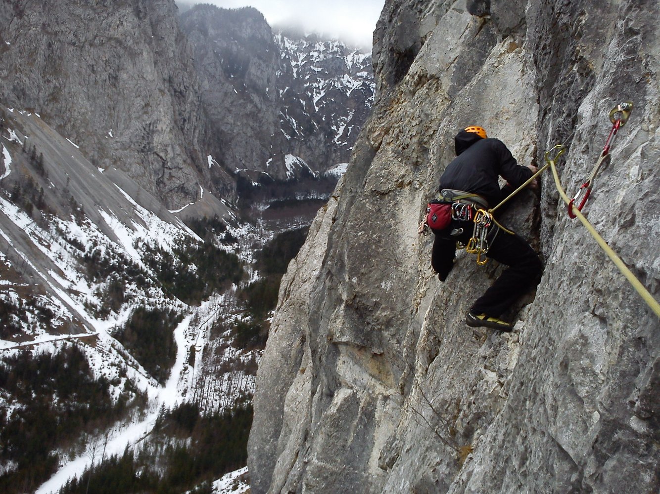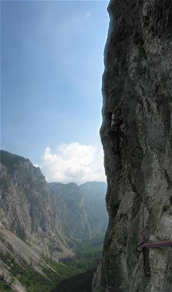 Toller Anstieg durch die zentrale Vordere Klobenwand. Sehr gut geputzt und anständig abgesichert hat Alfred Riedl wieder eine Genusstour ersten Ranges geschaffen, die sich auf der Rax ganz oben einreihen wird. Die Route bietet abwechslungsreiche Kletterei an Platten und Rissen im besten Fels.