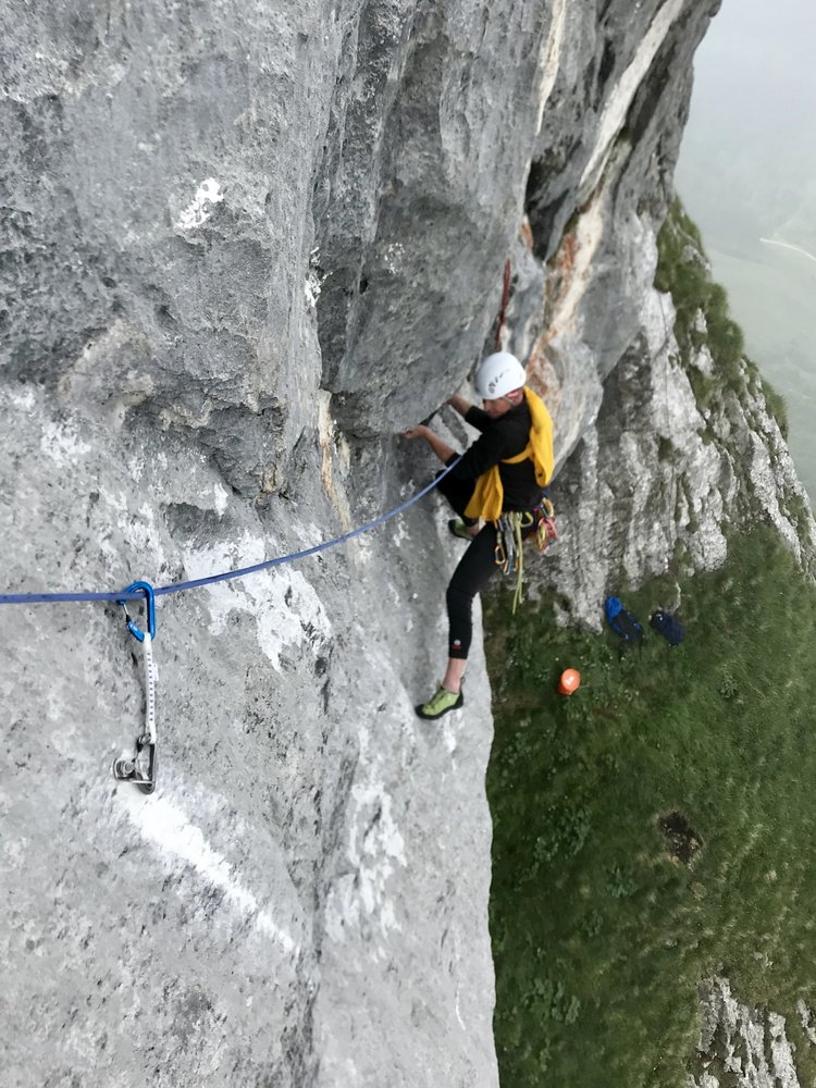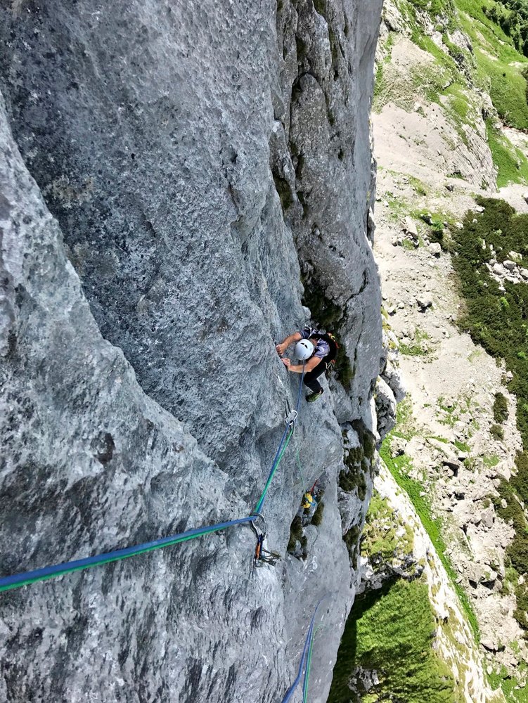 7 SL. 45 über steilen Wand und Platenbereich mit super steiler Plattenkletterei bis ca. VIII-